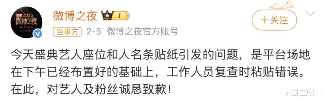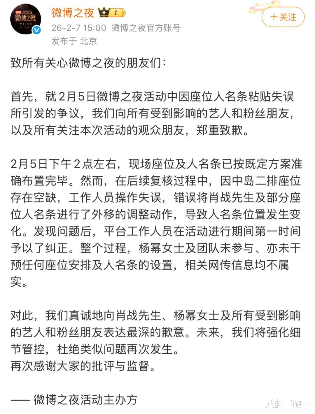 主办方连夜道歉,说是工作人员复查时贴错了,两天后又发声明强调“杨幂女士及团队未参与、亦未干预任何座位安排及人名条的设置,相关网传信息均不属实”。