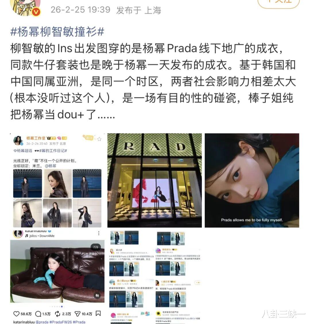因为杨幂早穿了一天,杨幂粉丝这边就觉得,哎呀,是不是柳智敏团队刻意模仿啊?想靠这种方式在内娱刷脸?