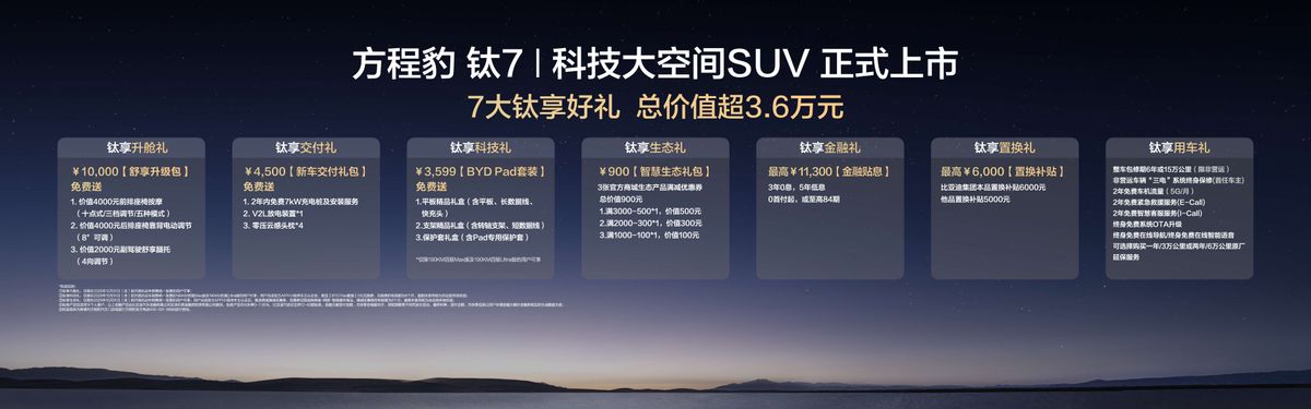 上市初期,方程豹为钛7用户打包7重权益:舒享升级包(含前排座椅按摩、二排小桌板)、BYD Pad车载套装、新车交付礼包全部赠送;金融端提供3年0息、0首付至高84期方案,置换补贴最高6000元;终身免费OTA、2年每月5G车机流量、非营运车主三电终身保修同步上线。官方小程序已开启“1元试驾”通道,下订即享优先交付。