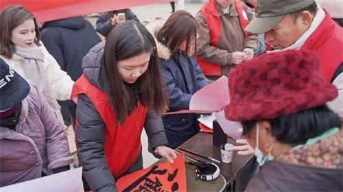 活动当日,实践队队员精心布置场地,一列长桌铺展开鲜红的宣纸,笔墨砚台整齐陈列,瞬间营造出雅致而喜庆的氛围。队员们充分发挥书法专业所长,以“福”、“寿”、“和”、“乐”、“安康”等饱含美好愿景的字句为主题,凝神聚气,挥毫泼墨。笔锋流转间,一幅幅对联力透纸背,一张张“福”字气韵生动,不仅展示了楷书的庄重、行书的流畅,也融入了队员们对乡村的真诚祝福。他们并非简单书写,更主动为围观的村民讲解不同书体的艺术特色、春联的平仄对仗讲究,让高雅的书法艺术以亲切可感的方式走进寻常百姓家。