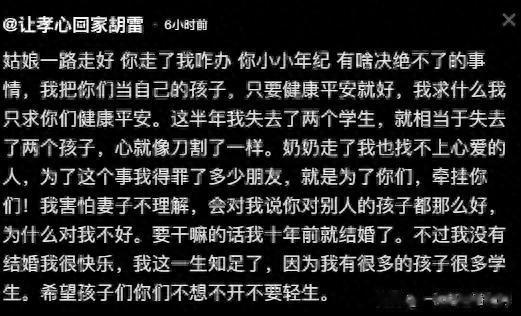 胡雷深夜连续发帖,字字泣血:“姑娘一路走好,你走了我怎么办?小小年纪,有何难题不能解决?我把你们当亲骨肉,只求平安健康。这半年痛失两名学子,心如刀绞。”