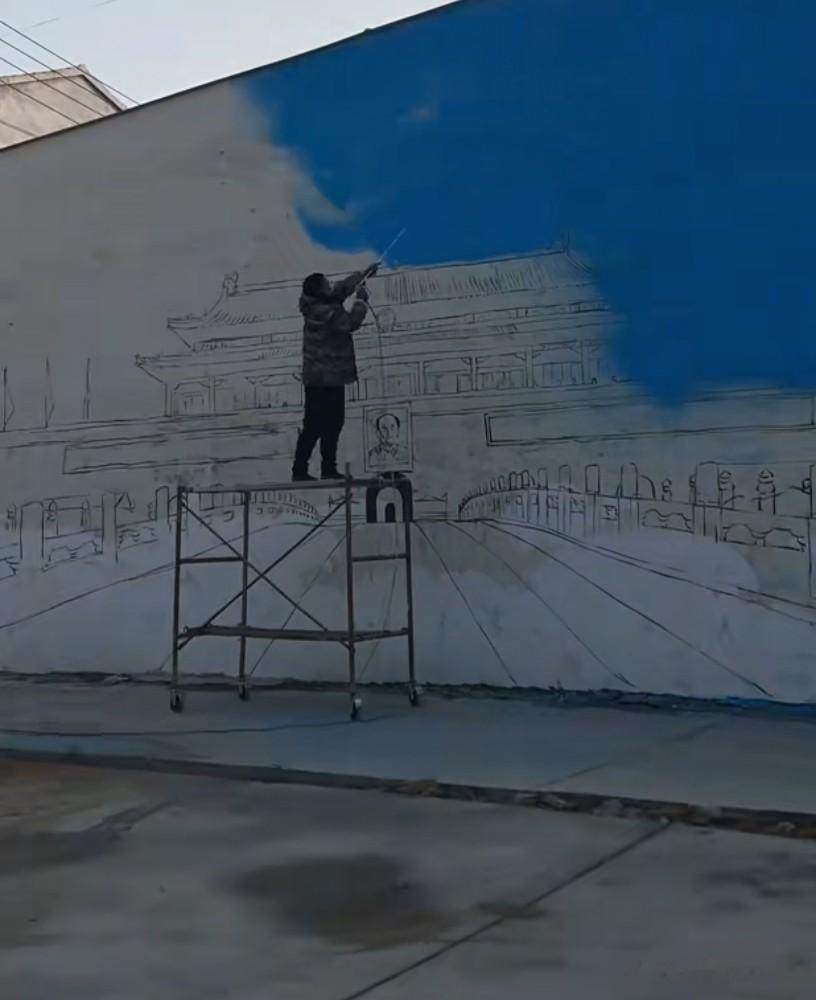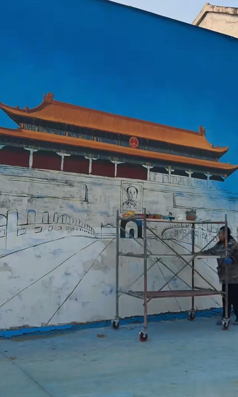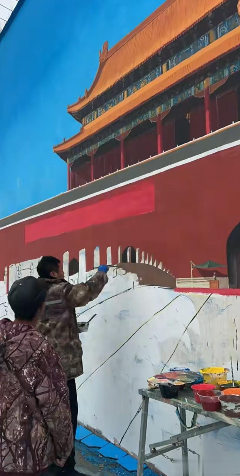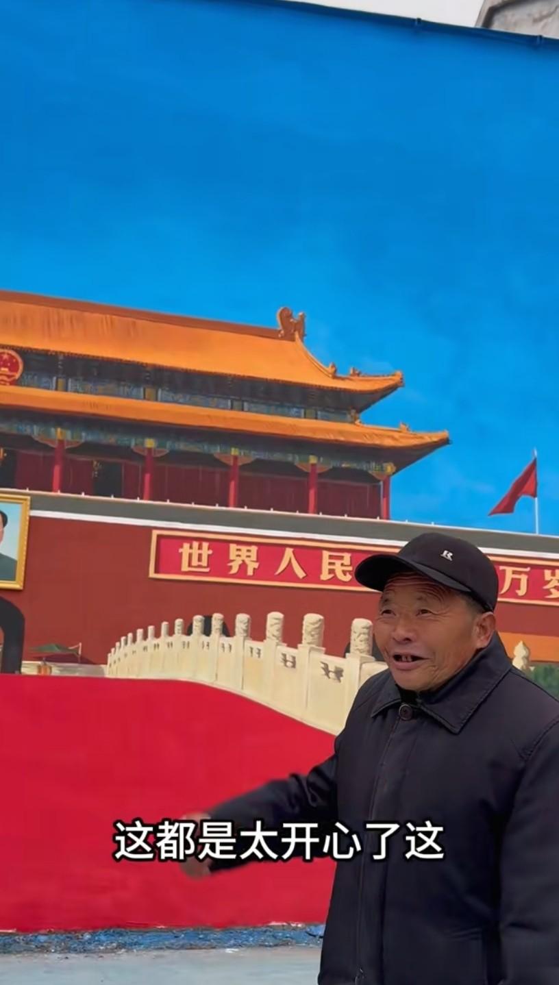 吴承言就想,正好村里有一块大墙,长18米,高8米,刚好不知道画什么,何不把天安门画下来,为他们圆梦!
