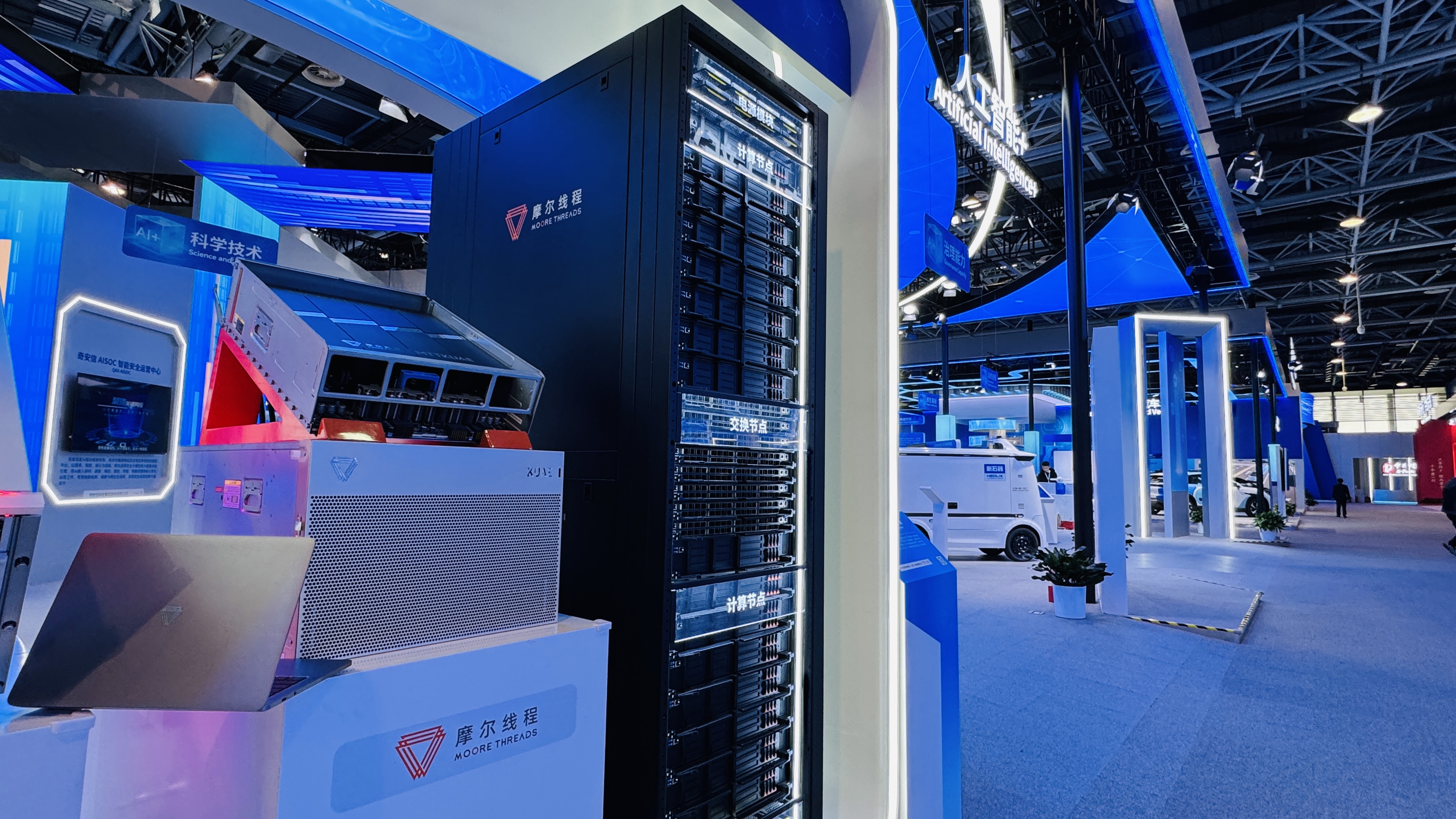 此外,摩尔线程在“人工智能+”展区集中展示了全栈自主算力解决方案,包括:旗舰级AI训推一体智算卡MTT S5000、搭载该卡的MCCX D800 X2液冷服务器、面向下一代超大规模智算中心的超节点架构设计,以及面向AI智能体时代的个人智算平台MTT AIBOOK。