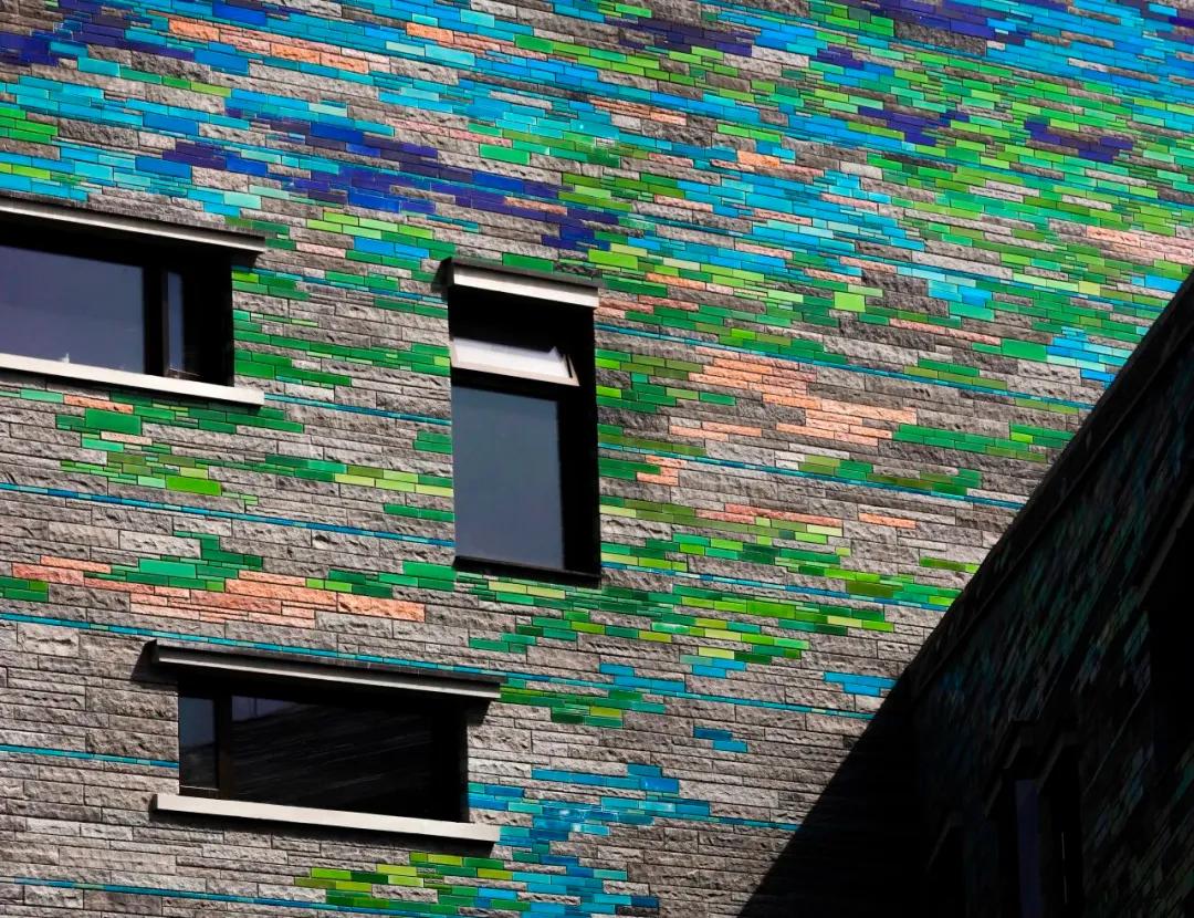 建筑整体仿佛层叠的山形,呼应不远处秦岭的起伏轮廓,将自然山势引入城市界面。外立面选用了彩色琉璃砖与天然石材,色彩汲取自唐代青绿山水与唐三彩的用色传统,经过反复试色才最终定调。在阳光映照下,砖面呈现出丰富的色泽变化,与远山遥相呼应。