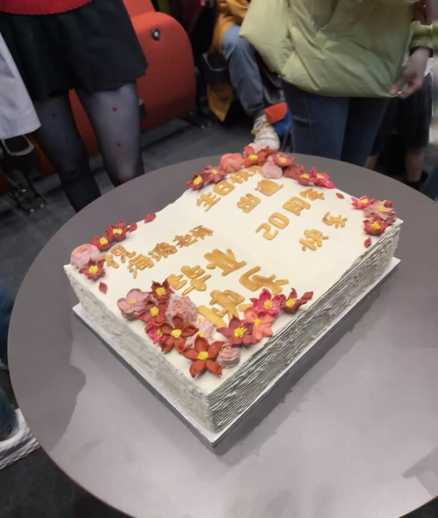 大大的蛋糕上,写满了祝福的话。祝:海涛老师毕业快乐,生日快乐,出道20周年快乐!这次聚会,名头还真多。