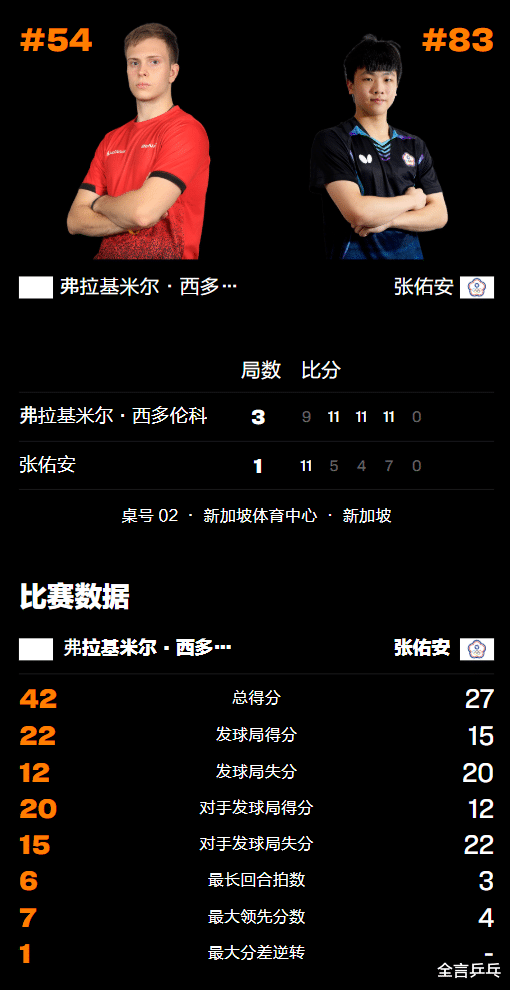 2026年2月21日晚,乒乓球WTT新加坡大满贯赛正火热进行,不久前才在海口亚洲杯上爆冷闯入男单4强的中国台北黑马张佑安已经结束战斗,在资格赛最后一轮1-3不敌俄罗斯个人中立选手、新科大运会男单冠军希德仁科(或译名西多伦科),无缘继续闯关冲击冠军,详细战况请看下文。