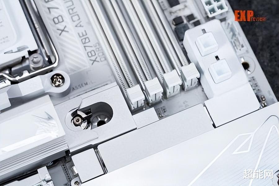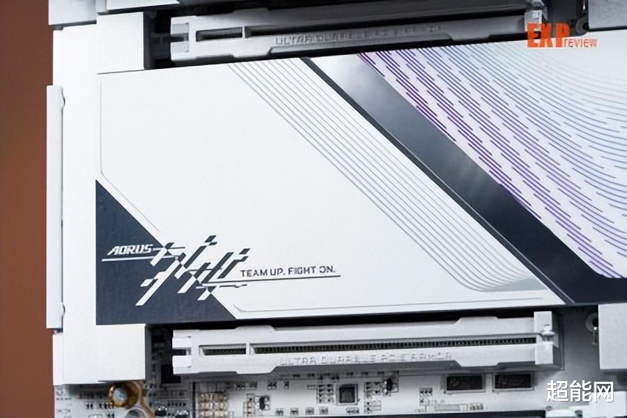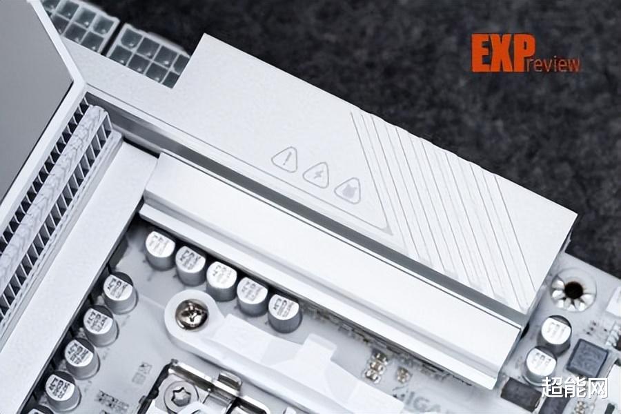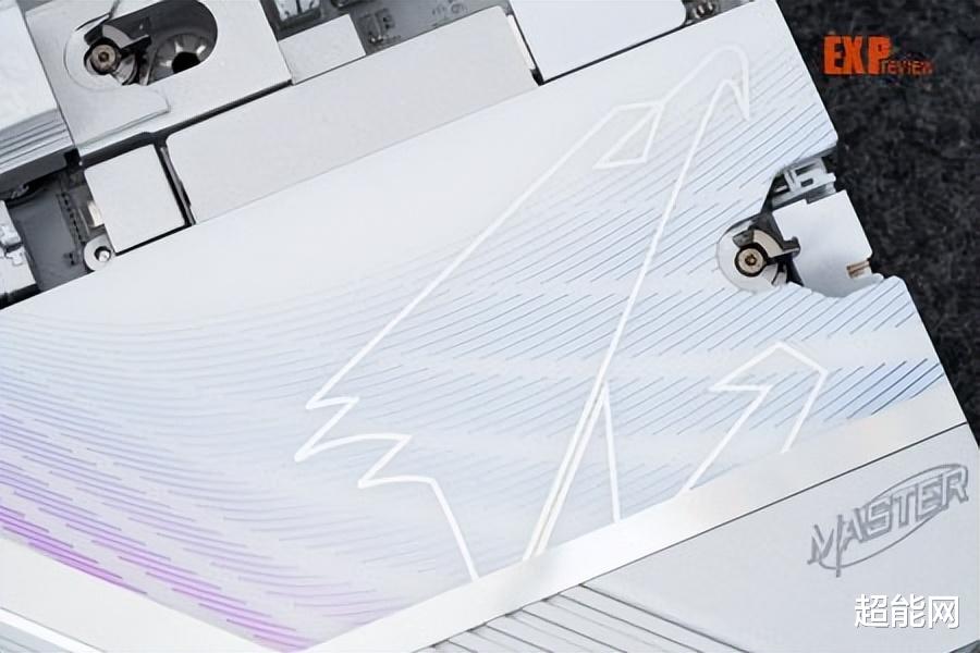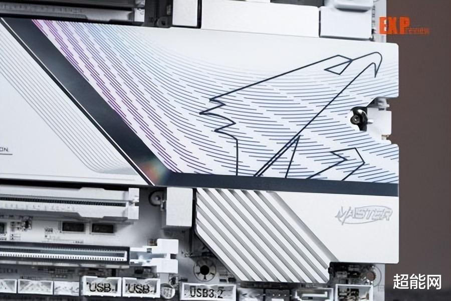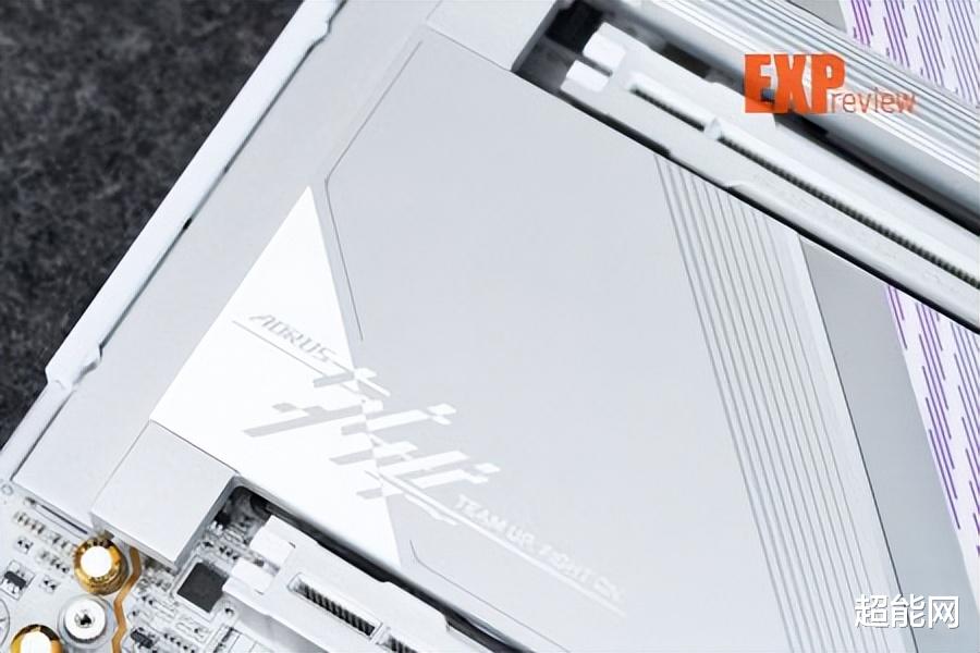 外观方面,最明显的变化自然是配色从此前的银色+黑色变成了以白色为主色调,所以名字也变成了超级冰雕,外观设计和超级雕较为接近,通过斜线纹理将所有散热装甲分割成三个层区,CPU供电主散热装甲上有大面积的RGB灯,南桥上方有一只AORUS经典的雕型Logo,南桥位置的散热装甲下方还配有氛围灯。此外这主板最显眼的地方就是上面有两PCIe快拆键,它们分别控制上下两个PCIe x16插槽,是首款采用这种设计的主板。