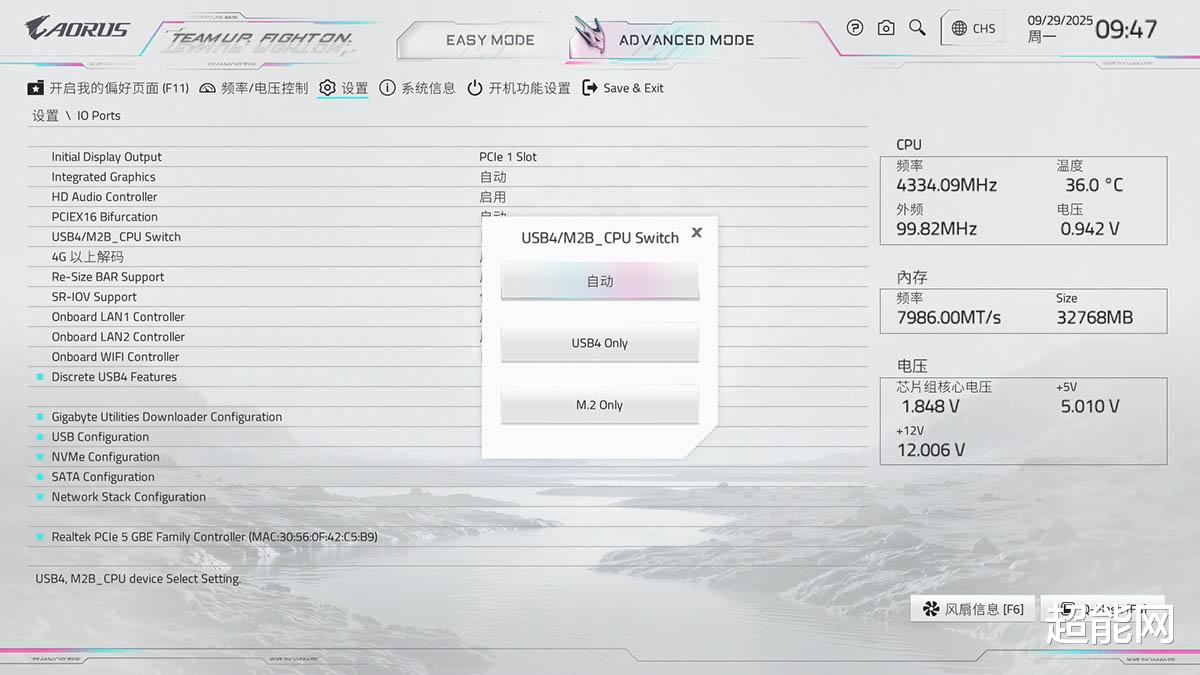 上面说的USB4/M2B_CPU通道切换在设置菜单里的IO Ports二级菜单里面,默认是自动,当M2B_CPU接口被使用时两边都降速成PCIe x2模式运行,而USB4 Only和M.2 Only就是把通道完全分配给USB4芯片或M.2口,如果把通道全给M.2口时,这两个USB4接口就会变成两个全功能的USB 10Gbps口,依然支持DP输出,其实这样的设置还不错。
