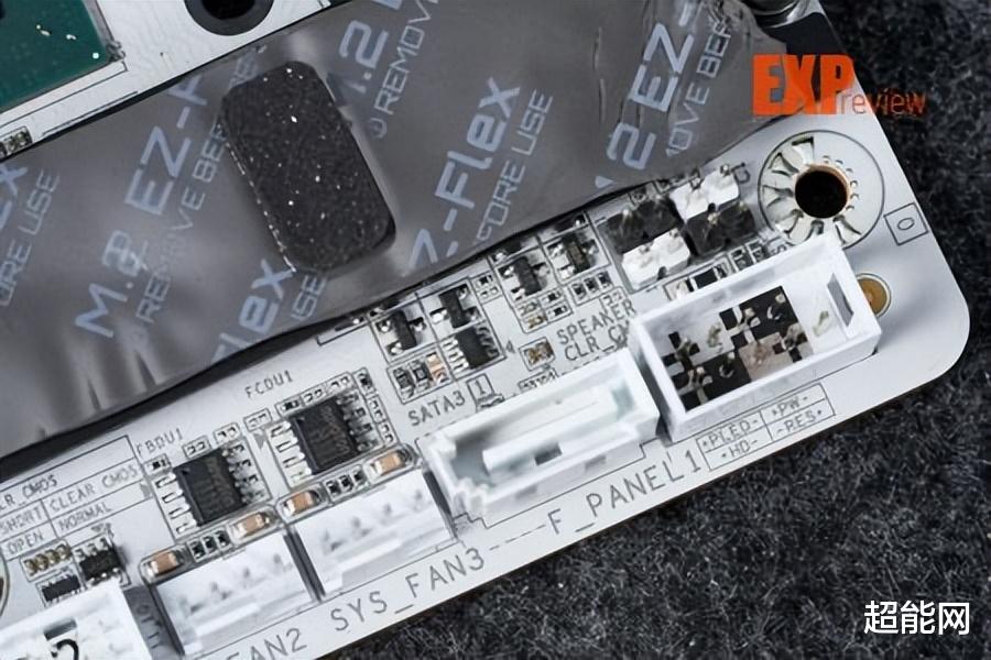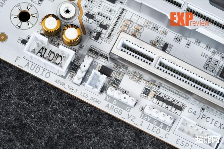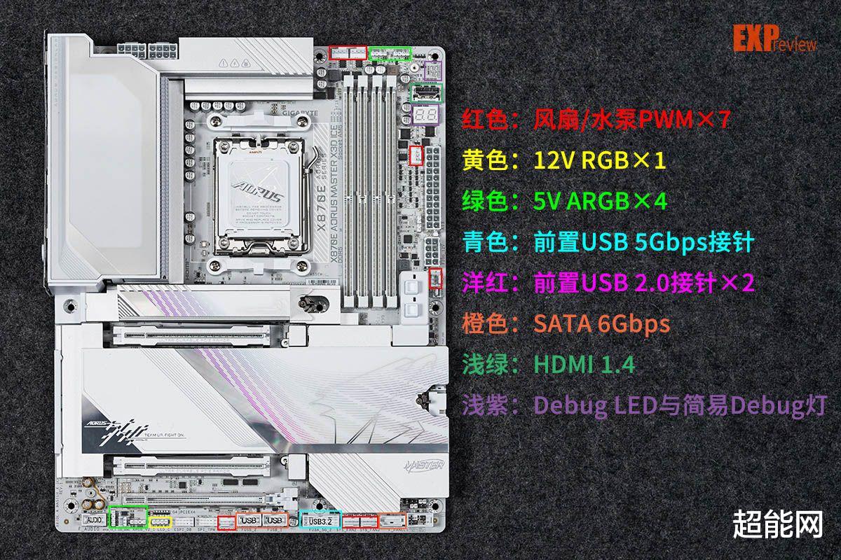 风扇接口主板一共有7个,还可以用个风扇延长线插槽额外扩展3个风扇口,加起来一共有10个4pin PWM接口之多。灯带接口有1个12V RGB和4个5V ARGB的,可满足各种需求。主板还配备Debug LED与简易Debug灯,方便用户找到故障位置。主板还提供了两个温度探头接口和一个噪音监测器接口,所需的传感器在主板的附近包里面,可以配合技嘉的GCC软件监控机箱内的温度和噪音情况。