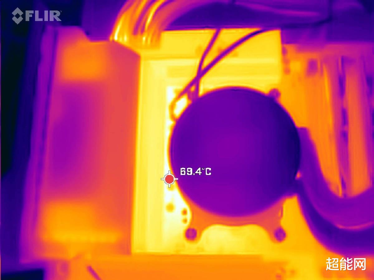 CPU供电模组在烤机时的最高温度是69.4℃,再加上这是开启PBO后的烤机测试,这主板的供电散热已经做得很好了,18相CPU供电也能很好的把热量分散,降低单颗MOSFET热量,即使是最新的锐龙9000系列16核处理器这款技嘉X870E超级冰雕都能轻松带动。