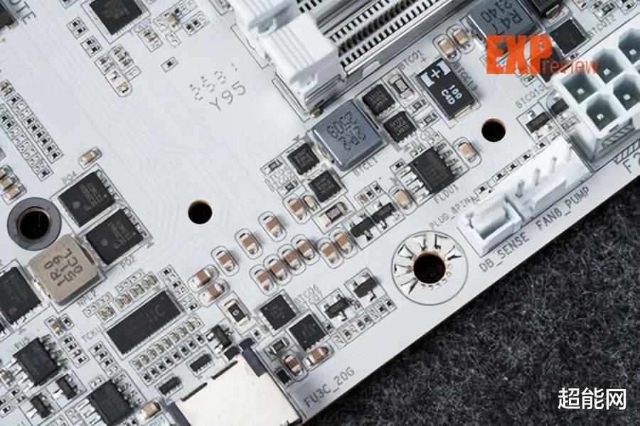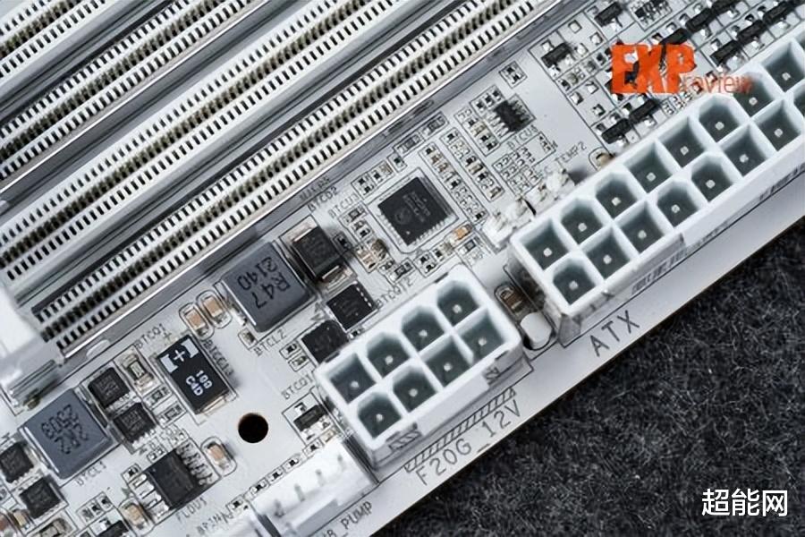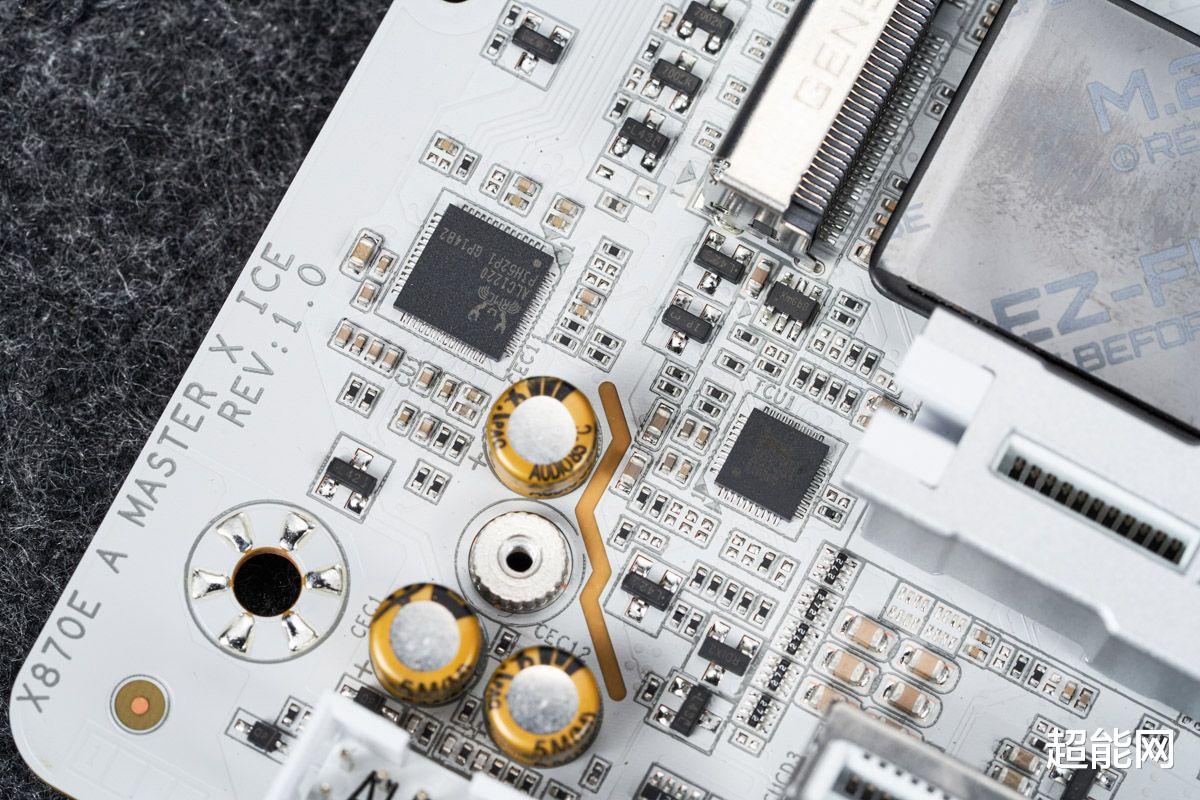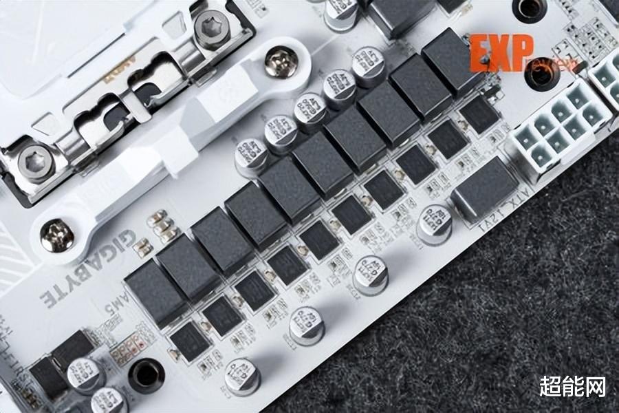 18+2+2相供电设计技嘉X870E超级冰雕的供电从X870E超级雕的16+2+2相升级为18+2+2相,CPU与核显供电使用英飞凌的PMC41430 Dr.MOS,单颗最高输出110A,属SPS智能供电芯片,能够实现独立监控、优化每一相供电,实时调整供电参数,确保处理器在不同工作负载下都能获得稳定的电力供应。供电控制芯片为英飞凌的XDPE192C3D,最大支持12相双通道供电,即核心供电部分实际应该为9相并联。辅助供电采用的MOS是安森美的NCP302155R,它也是Dr.MOS,单颗最大输出60A,这两相供电由立琦RT3672EE控制。