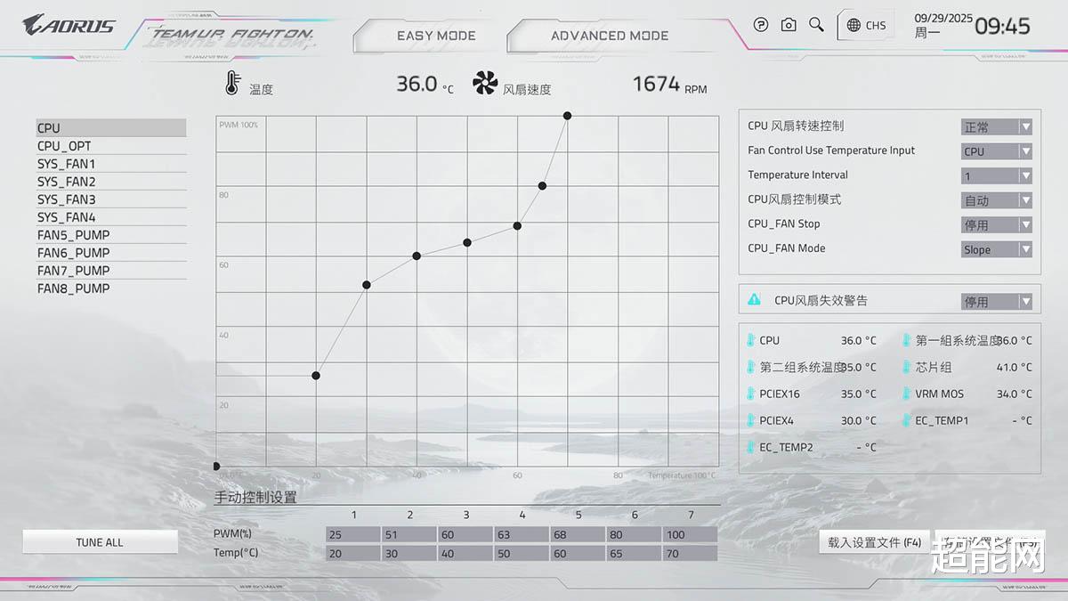 风扇转速设置页面中囊括了几乎所有的可调项,无需再去高级模式中进行微调。值得注意的是EC-TEMP1和EC-TEMP2对应的是主板附送的两根温度监测探头的实时数值,如果用户接上之后可以在这里查看,并且让系统风扇根据其温度来制定转速曲线。