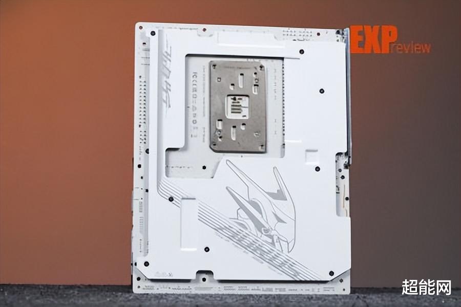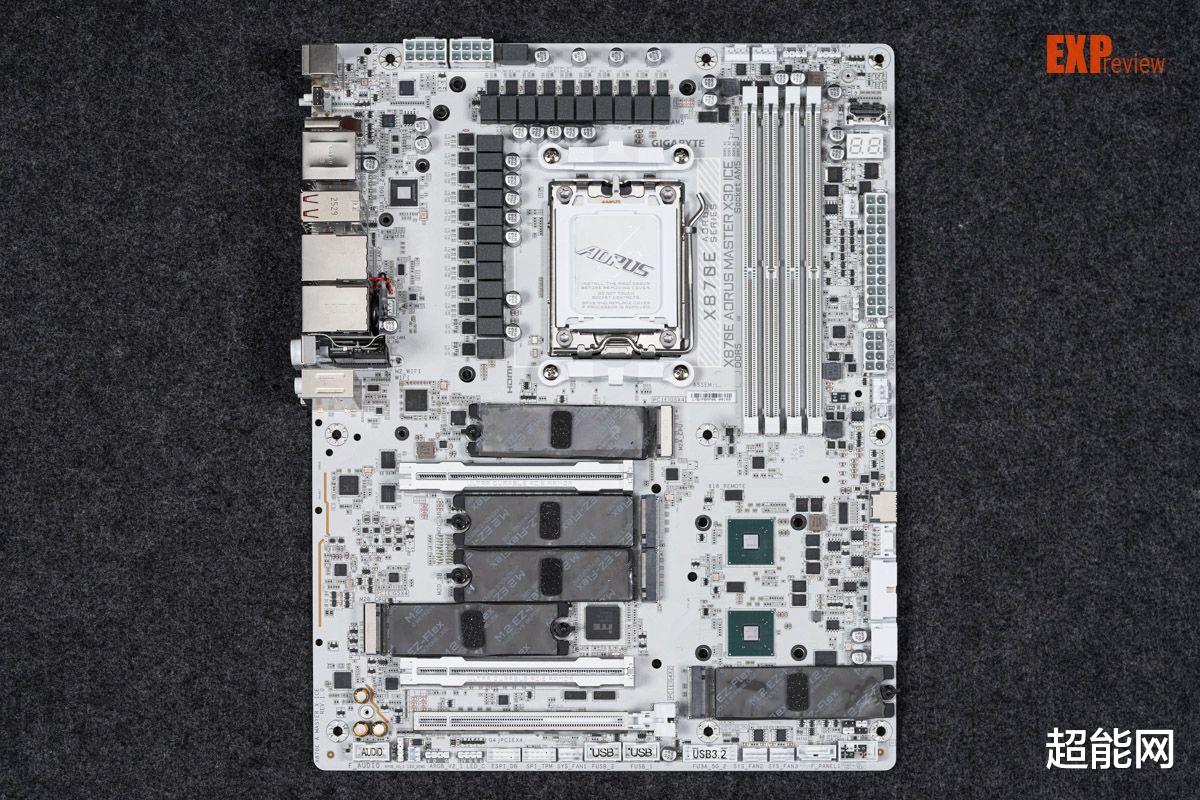 技嘉X870E超级冰雕加上了背板,上面印了一个非常显眼的大雕头部,金属背板可以很好的保护主板PCB,不让主板变形,此外可以看出背板上有明细的凹槽,这些凹槽位置都贴了导热垫,可以帮主板上的高温元件散热,从凹槽位置来看,应该是VRM供电MOS、万兆网卡以及两颗南桥的背面。