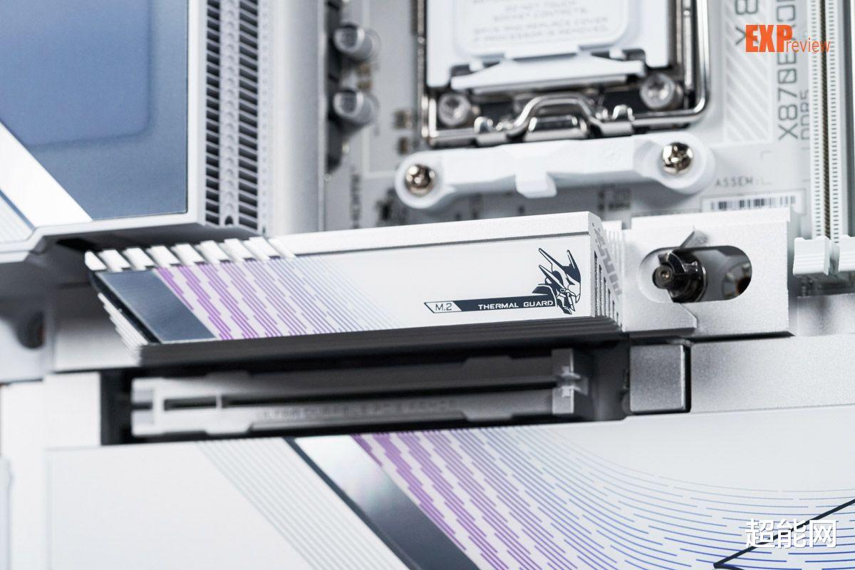 说起方便,X870E超级冰雕在便利性上也进行了非常多的优化,双显卡快拆键应该是这款主板首创的,主板的所有M.2散热装甲与M.2锁扣都采用了快拆设计,玩家无需工具就能拆装M.2 SSD,而M.2弹性底座则可对M.2 SSD的厚度自适应,让散热底座可以自动贴紧M.2 SSD的背面,让SSD两面都能有散热片降温。