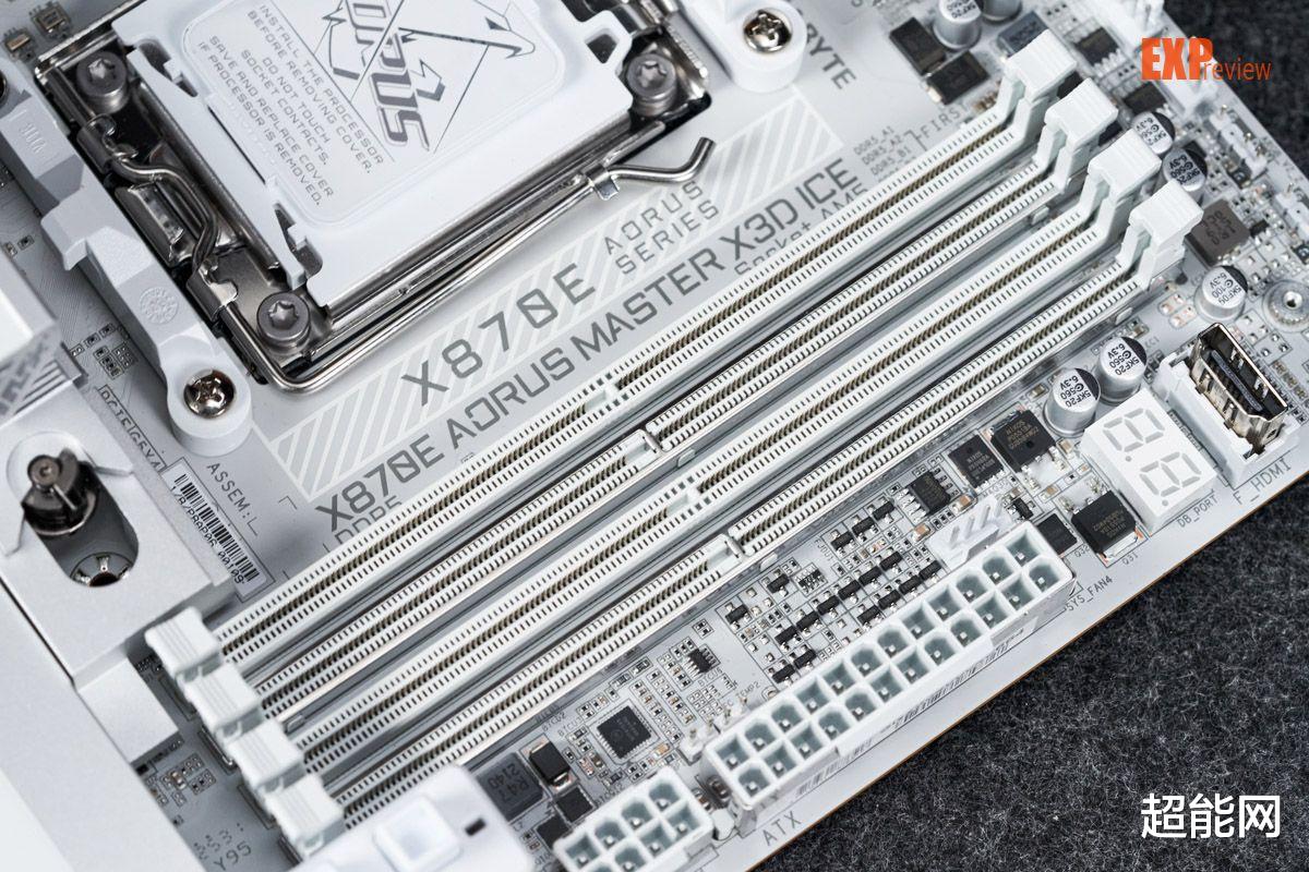 内存接口技嘉X870E超级冰雕配备四根DDR5内存插槽,内存固定方式为传统的两端卡扣设计,支持单根64GB的内存,最大内存容量256GB,最高可支持双通道DDR5-9000(OC)的内存,支持AMD EXPO和Intel XMP内存。
