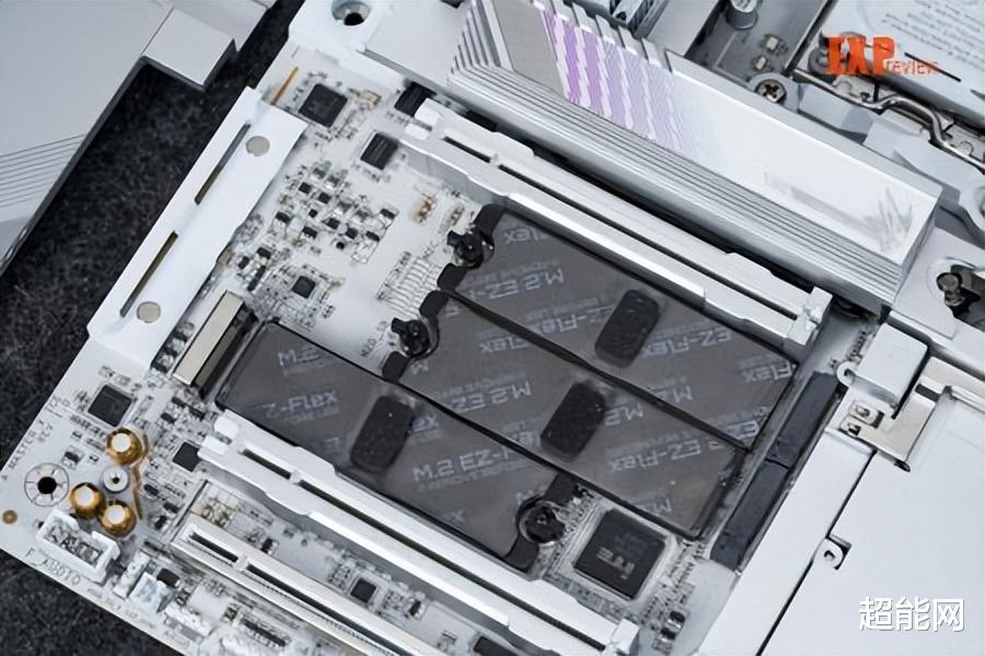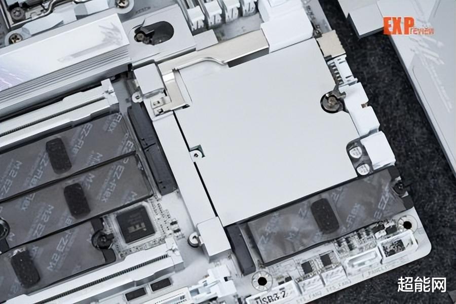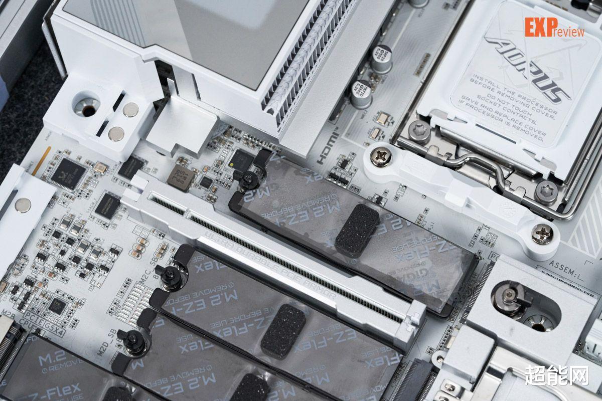 技嘉X870E超级冰雕主板的所有M.2口都配备弹性底座,可以改善M.2散热背板对SSD贴合不好的问题,因为M.2 SSD其实是有单双面之分的,双面的M.2 SSD更厚,所以M.2散热背板得根据双面的厚度来设计,对于单面的SSD就只能没照顾得那么好了。现在技嘉的M.2 SSD弹性底座顾名思义,具有弹性,底座可以根据M.2 SSD的厚度自动贴合,可以更好的给SSD背面散热,也能为M.2 SSD提供良好的背面支撑,避免它被散热装甲压弯。