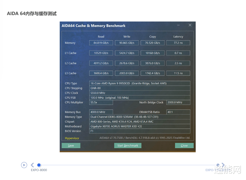 内存测试这款X870E超级冰雕主板可以轻松点亮DDR5-8000的EXPO内存,其实这时就有相当不错的内存带宽和延迟表现,但我们依然可以在BIOS里面开启XMP/EXPO高频宽模式,开启后内存带宽有了明显提升,延迟也从77ns降低至70ns,这功能相当好,玩家可以轻松获得更好的内存性能。