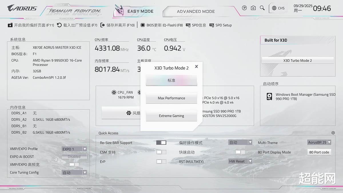 今天我们就拿到了定位较高的X870E AORUS MASTER X3D ICE超级冰雕主板,其实看名字就知道它和我们此前测试的X870E AORUS MASTER 超级雕主板有关系,在新的主板上技嘉为其准备了X3D Turbo 2.0技术,新的模式可以直接在系统里面进行切换,开启后可智能识别游戏、设计等不同负载场景,自动调校核心参数,无需手动设置即可实现性能提升。