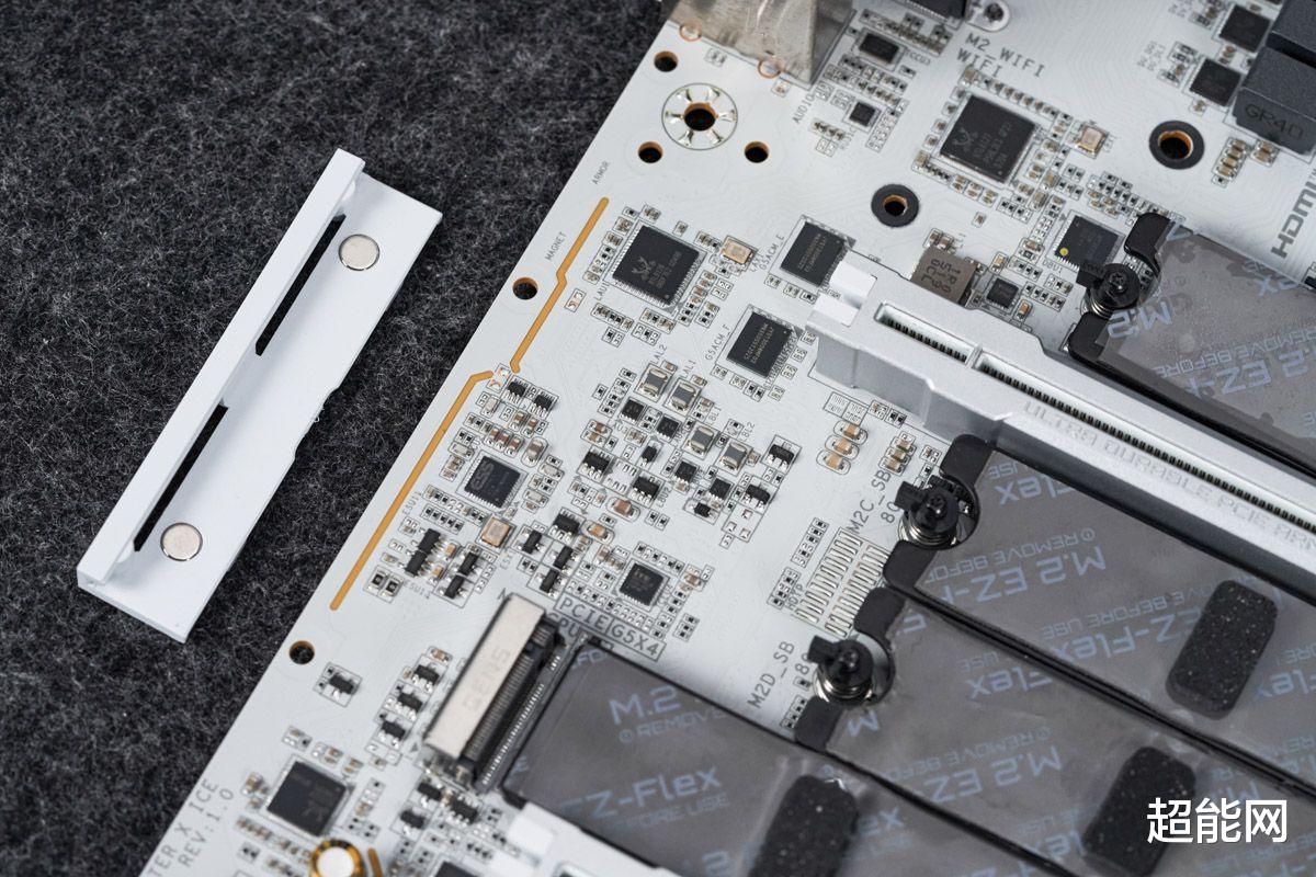 主板一共有5个M.2接口,所有接口都配备M.2散热装甲和背面散热,让SSD能享受全方位的散热。同时所有M.2接口都配备快易拆,同时两个装甲也具备快易拆设计,而且还有磁吸定位设计,所有M.2 SSD安装与拆卸都不需要工具,相当方便。