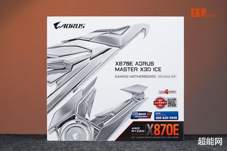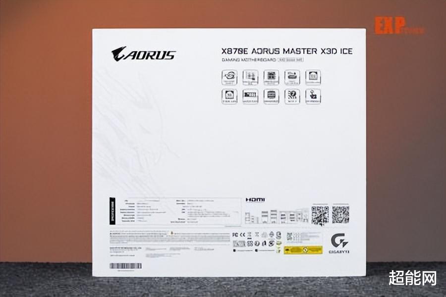 技嘉X870E AORUS MASTER X3D ICE主板介绍作为冰雕系列产品,X870E AORUS MASTER X3D ICE采用了全白色的包装,包装正面印有主板的型号和技嘉AORUS的雕型Logo,而背面则印有主板的特性,很明显的写着主板采用18+2+2相供电设计,支持X3D Turbo 2.0技术,配备双PCIe插槽快拆,配备10G+5G双网卡,支持WiFi 7。