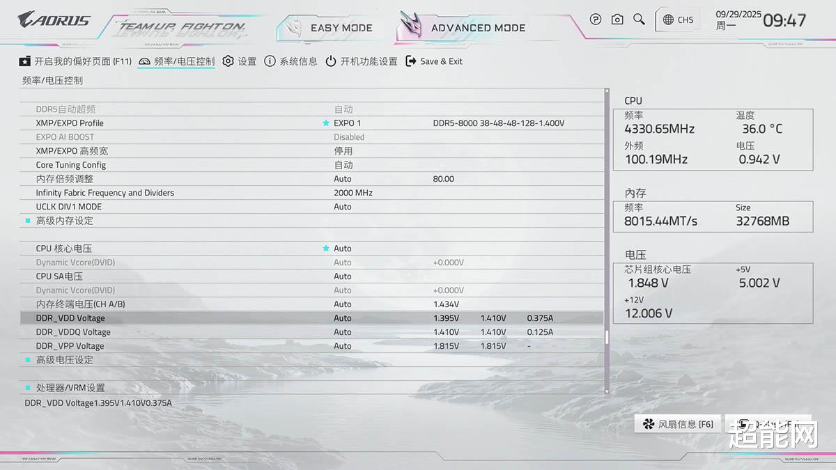往下拉就能看到电压调节选项,内存电压这里可以看到三个数值,最左边的是当前的设定值,这里是可供玩家修改的,中间的是当前电压值,右边的是则是当前电流值,说真的这两个电压值第一眼看上去其实不太好理解,技嘉最好后面加一下标注。