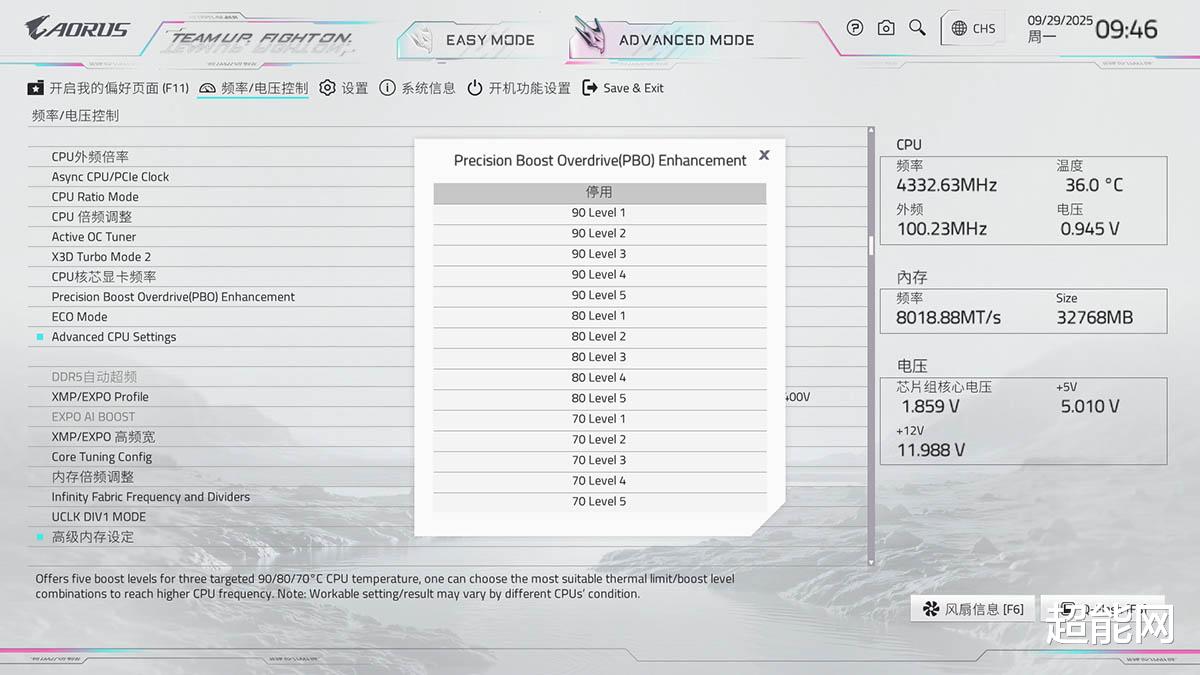 高级模式下,频率/电压控制菜单里可以找到PBO Enhancement选项,根据用户日常的CPU温度划分出了70、80、90三个主要挡位,并且进一步按性能调度的激进程度再分了5个等级,等级越高性能调教越激进,给的负压也越大,所以能拉到什么等级完全看你手头上CPU的体质。