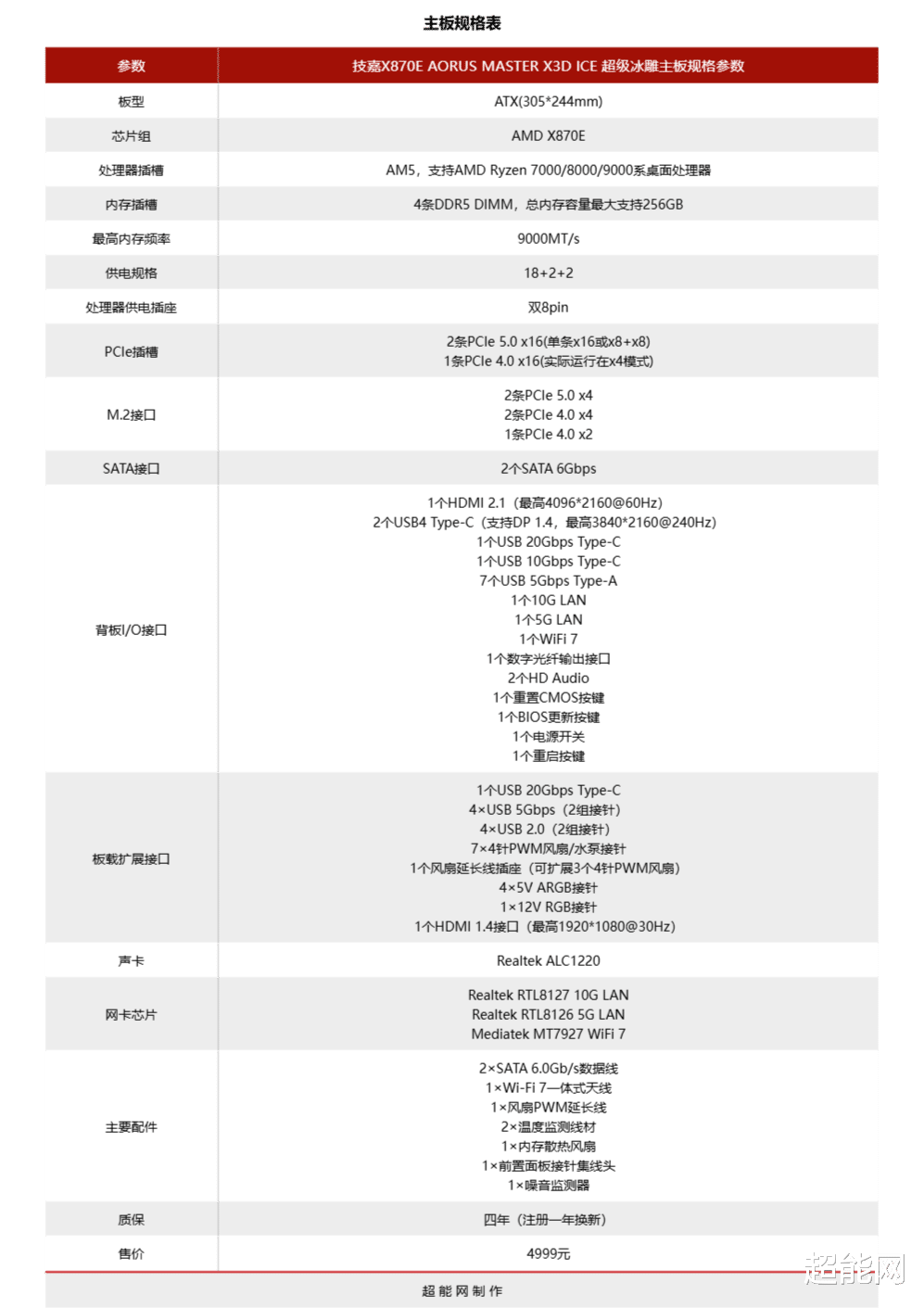 技嘉X870E AORUS MASTER X3D ICE超级冰雕是一块标准的ATX主板,尺寸是30.5*24.4cm,售价是4999元,这价格和技嘉X870E AORUS MASTER超级雕刚上市时是一样的。