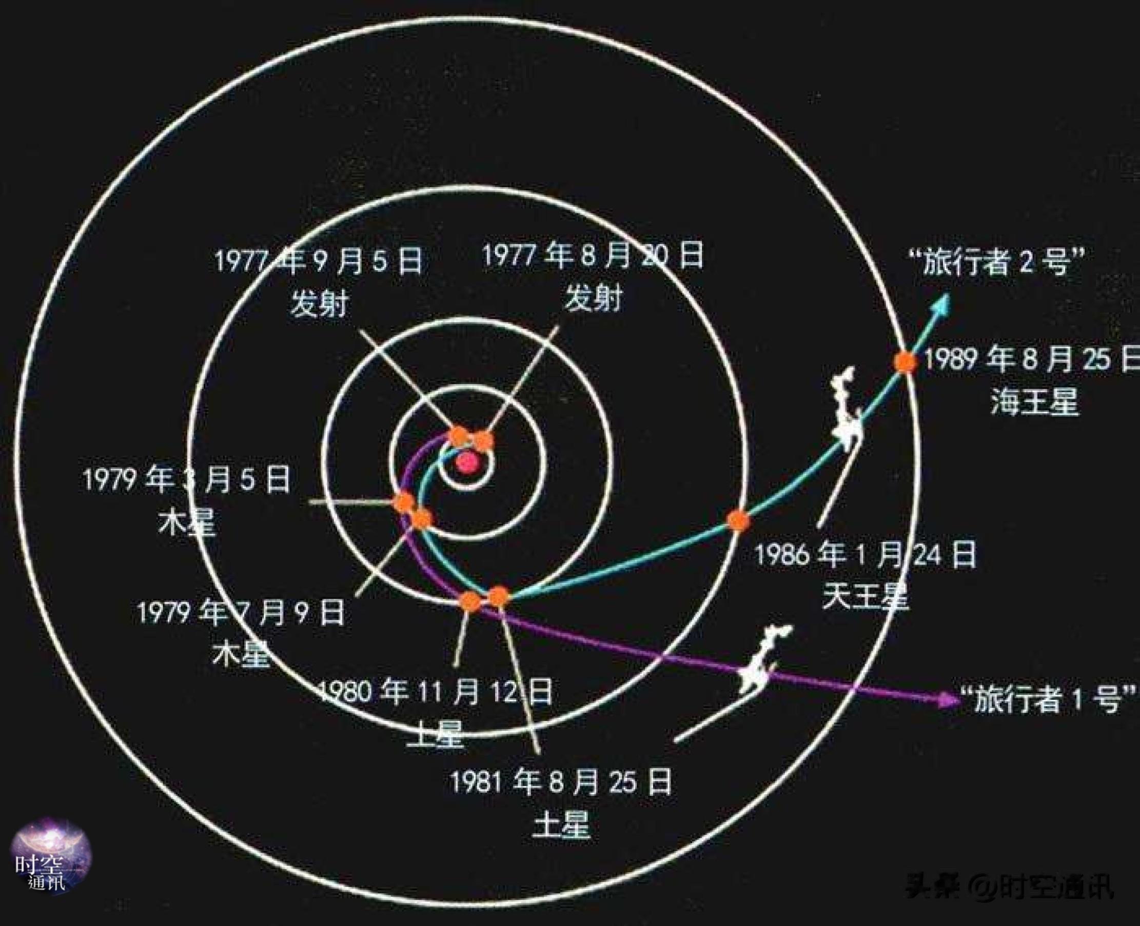 前面说了,旅行者号探测器实际上是1号和2号两艘几乎一样的探测器,因此完全可称为姊妹探测器。但她们行进的路线和未来飞出太阳系的方向不一样,速度也略有差别。事实上,妹妹旅行者2号还先行一步,于1977年8月20日就发射升空了,而姐姐1号1977年9月5日才发射升空,但老大就是老大,仅仅48天后就超越了老二。