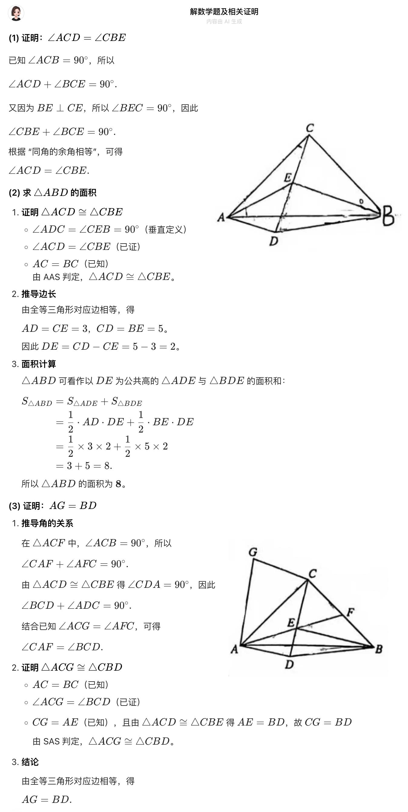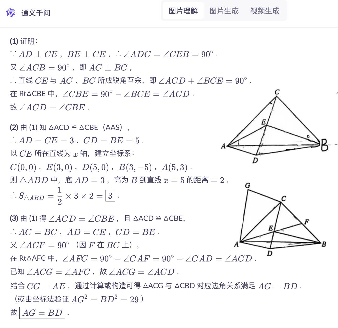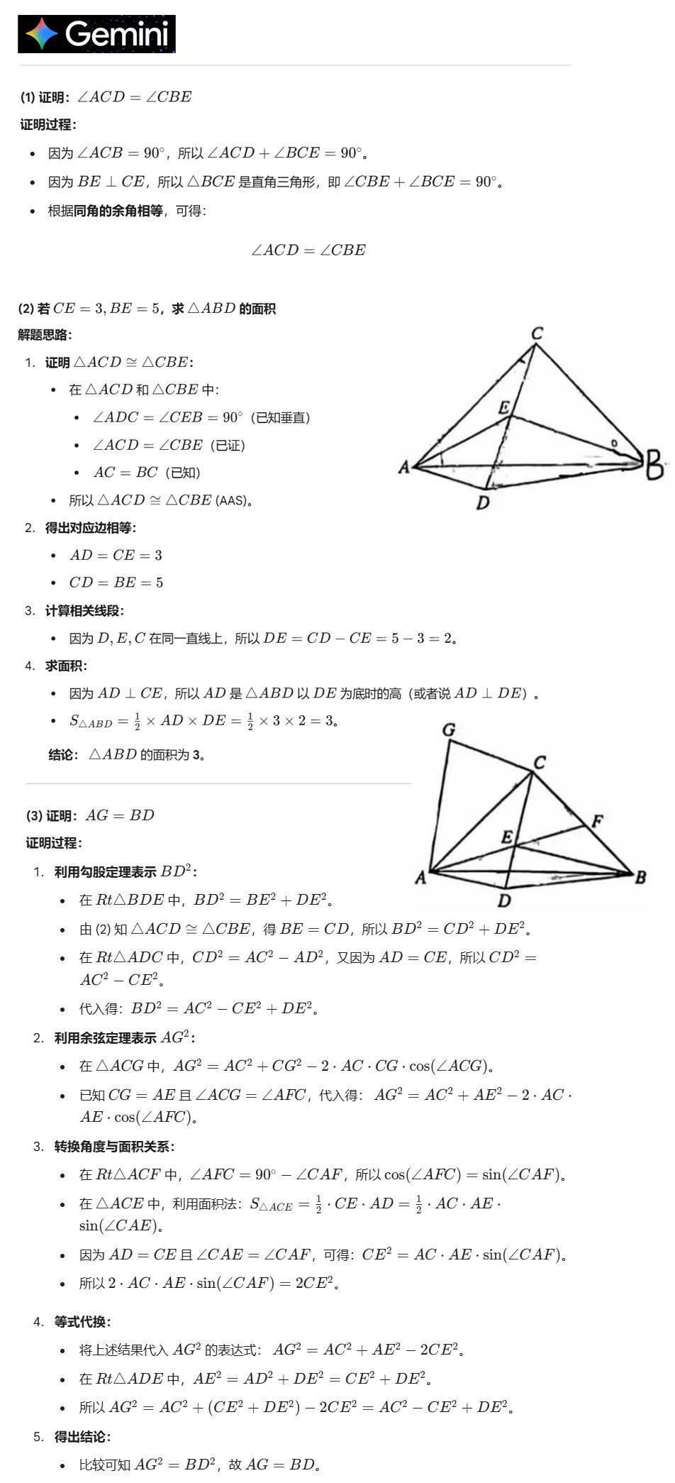 本次测试选用的题目并非偏题怪题,而是初二数学试卷中常见的几何综合压轴题,难度适中,核心考察三角形全等、图形变换与隐含条件挖掘能力,属于尖子生能独立破解、优等生稍加引导可完成的范畴。测试对象涵盖国内主流AI与国际知名模型:豆包、千问、元宝、百度AI,以及Gemini,均采用默认设置,将题目以图形方式输入,并告知这是初二的数学题,要求给出详细解题步骤与最终答案。