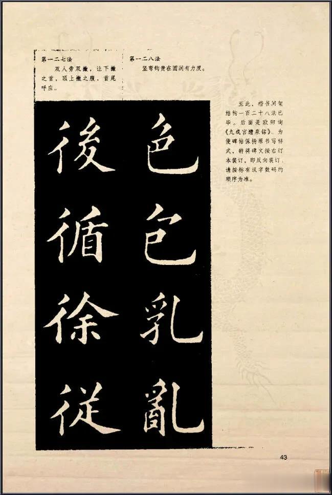 范本选取的欧体例字精准还原了欧阳询楷书“险绝中求平正”的特质,笔画刚劲、结构严谨,128法的分类则覆盖了独体字、合体字的各类结字难题,让学习者能循法悟理,逐步掌握欧体楷书的空间布白与形态法度。无论是书法入门者打基础,还是进阶者精进结字技巧,这本教程都堪称解码欧体楷书的钥匙,让千年经典书法的学习有章可循。