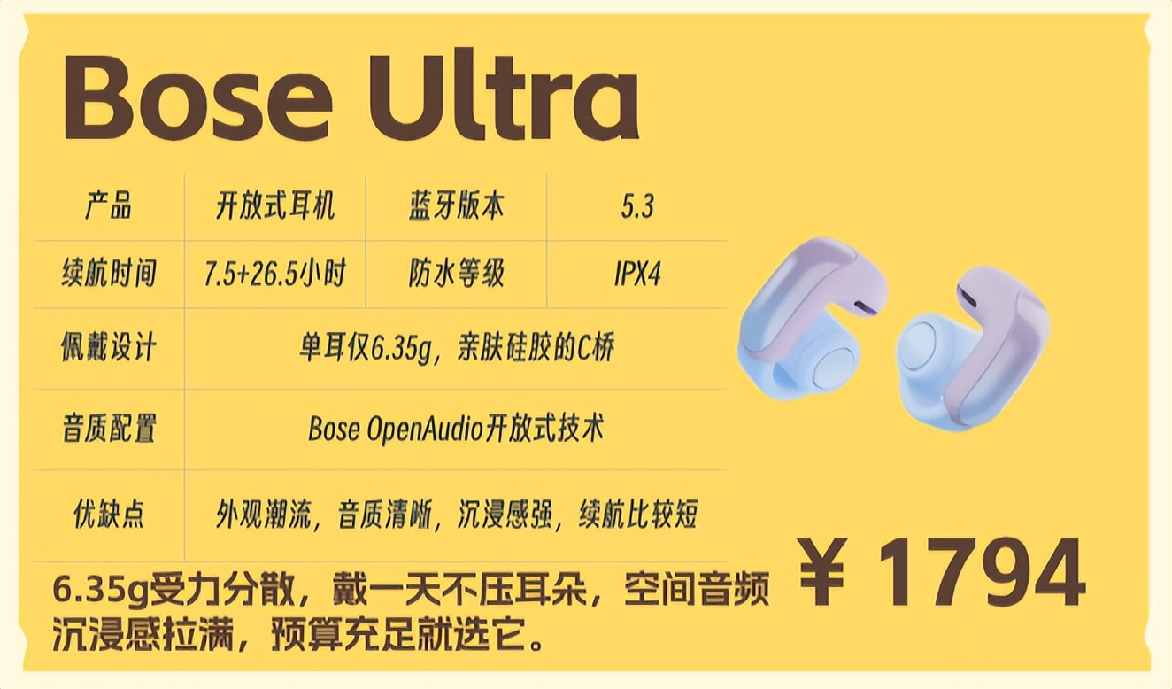 购买建议如果你预算充足,想要一款能提升生活品质的耳机,Bose Ultra的舒适度和音质都能给你惊喜,尤其是空间音频功能,能让日常听歌、看剧的体验提升一个档次,适合追求高端体验的打工人。