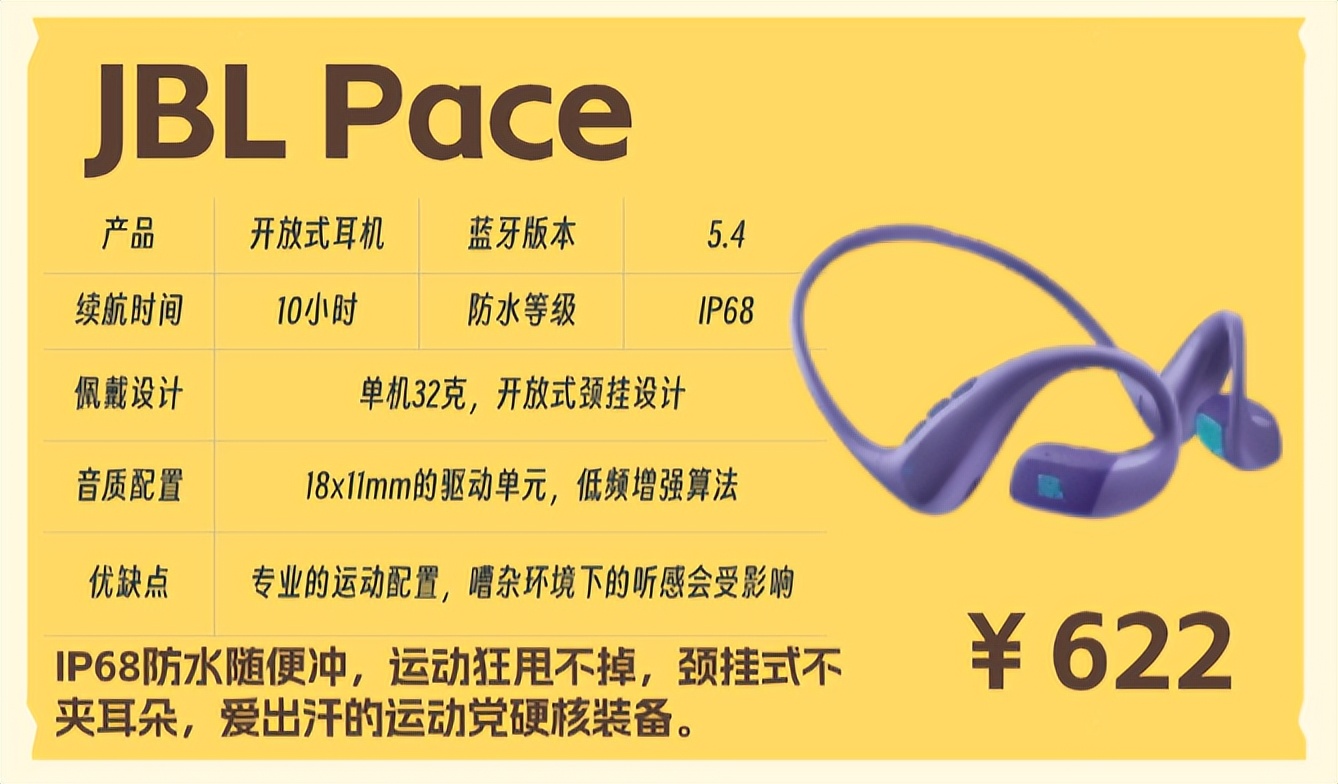购买建议如果你是热爱运动的打工人,想要一款既能满足跑步、健身需求,又能兼顾日常通勤的耳机,JBL Pace的防水性和佩戴稳定性完全能打,而且音质也能满足日常需求,是运动打工人的绝佳选择。