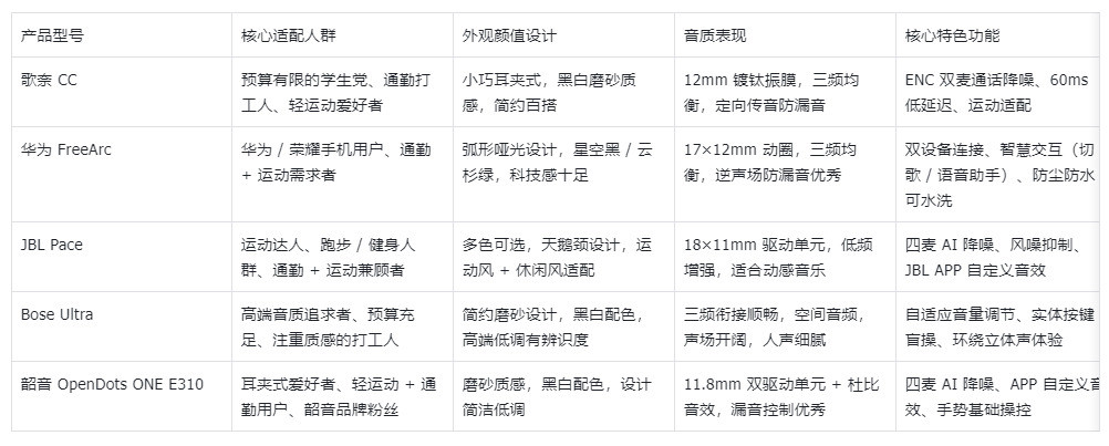 1.预算有限选歌奈CC:百元价位就能搞定通勤、办公、轻运动全场景,续航超强,舒适度拉满,性价比无可挑剔。 2.华为用户选FreeArc:完美适配华为生态,智能交互便捷,佩戴舒适,眼镜党也能放心用,日常通勤加轻运动都能满足。 3.运动达人选JBL Pace:IP68级防尘防水,佩戴稳固,运动时完全不用担心掉,续航也能覆盖运动加通勤,是运动打工人的绝佳选择。 4.追求高端选Bose Ultra:舒适度和音质都是顶级水平,空间音频效果惊艳,预算充足的话,能大幅提升日常听歌、看剧的体验,适合追求高端体验的打工人。 5.看重音质选韶音E310:耳夹式耳机里的音质佼佼者,佩戴稳定,漏音控制好,适合喜欢耳夹式设计的用户,注意确认耳型适配。
