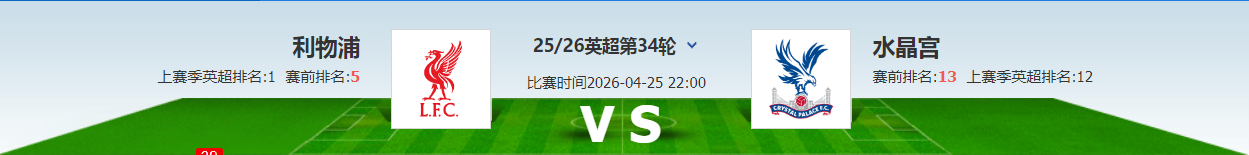 英超第34轮继续进行,本场由主场的利物浦迎战水晶宫。利物浦目前取得了16胜7平10负的成绩,积55分排在积分榜第5位;水晶宫目前取得了11胜10平11负的成绩,积43分排在积分榜第13位。
