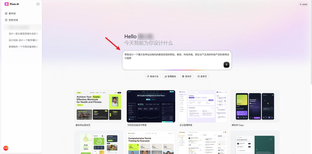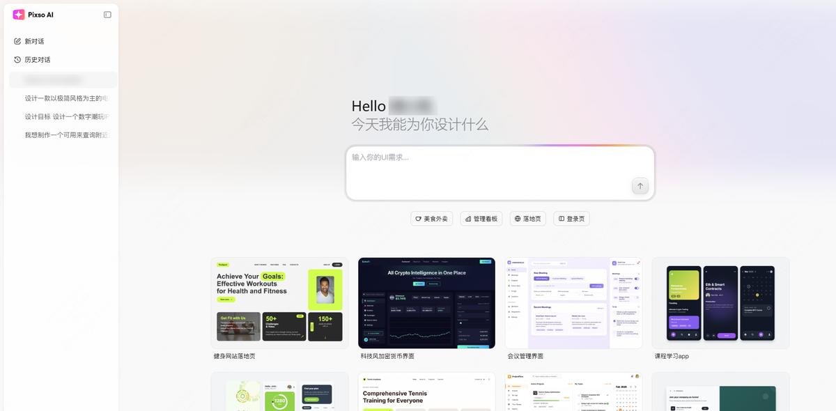 下图是Pixso AI生成设计稿的首页,在中间的输入框键入想要生成的设计稿需求,如设计稿主题、风格、配色、样式要求等,完成后按下回车键,或是点击输入框右下角的箭头。