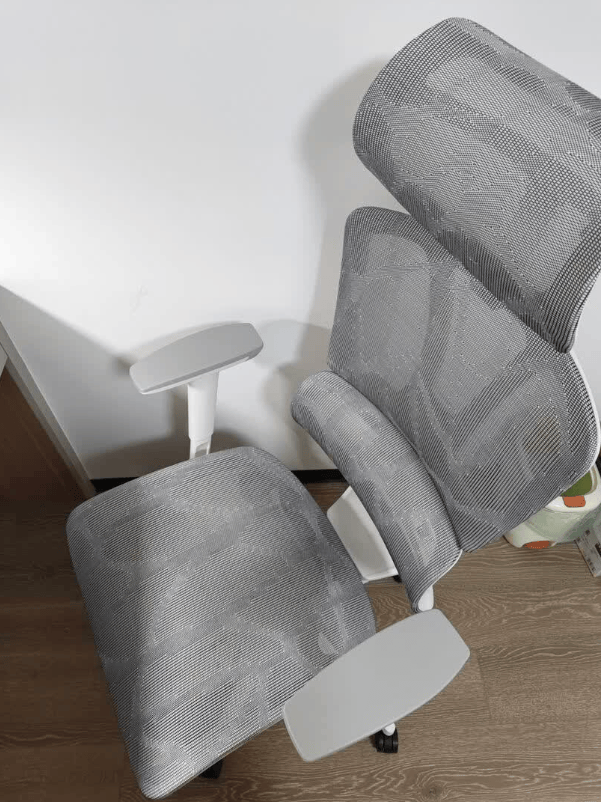 椅子是常见的工学椅造型,简洁不花哨,放在办公区很协调。腰靠的随动支撑用着很省心,不管是正坐办公还是后仰放松,腰部都能有贴合的支撑感。网布透气性确实不错,夏天久坐也不会觉得闷。调节功能很全,扶手多方向调节能适配打字、看屏幕等不同姿势,午休时拉出腿托、调后仰角度就能舒服歇会儿。稍微不足的是坐垫偏硬,而且腰部支撑位置偏上,骶骨部位承托稍显不足,另外椅子自重有点大,移动起来不算轻便,但整体用着挺顺手,能满足日常办公需求。