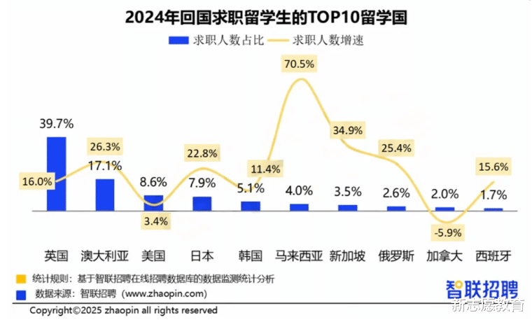 拥有欧美国家留学背景的海归仍然占据大部分,不过,值得注意的是,在2024年,来自马来西亚、新加坡的回国留学生分别增长了70.5%和34.9%,这也表明亚洲留学正在成为中国留学生的新选择,潜力比较大。