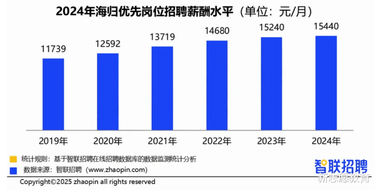 对国际化人才需求量较大的制造业、新能源、环保等行业的优先岗位,留学生回国后的就业平均薪资也是一路上涨。从2019年的11739元/月增至2024年的15440元/月,涨幅达到了3700多元,这一收入水平在国内相对较高。