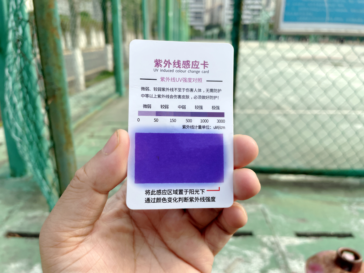 为了验证真实防晒效果,我选择在正午12点(紫外线最强时段),在户外空旷场地用专业紫外线测试卡与紫外线强度仪进行实测。当天户外紫外线指数达到 11,属于极强级别,未遮挡的测试卡瞬间变成深紫色,紫外线强度仪数值稳定在 980μW/cm²。