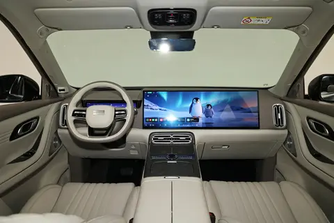 银河M9的内饰设计豪华感十足,尤其是中控台上这个30英寸的中控屏,副驾驶坐在这里可以看电视,车内大部分地方都是软包材质。多功能方向盘有加热的功能,冬天开车不手冷。前面是12.66英寸的仪表盘,车里有32英寸的HUD抬头显示。因为用的是怀挡的设计,扶手台这里的设计很简单,除了手机无线充电板之外就是杯架,没有多余的设计。银河M9的车里也配备了车载冰箱,有冷冻的功能。车内的氛围灯颜色种类丰富,亮度也可以调节。车机搭载了高通骁龙8292芯片,车机操作起来灵敏反应速度很快,车机上有高德地图,手机互联的方式也挺多的,升温识别和面部识别都有,疲劳驾驶提示提示可以避免我疲劳驾驶。语音识别精确迅速,大模型还可以增强人机互动的体验。银河M9的车里有17.3英寸的后排娱乐屏,搭配上车里的27个扬声器,在车里观影或者K歌体验都不错。