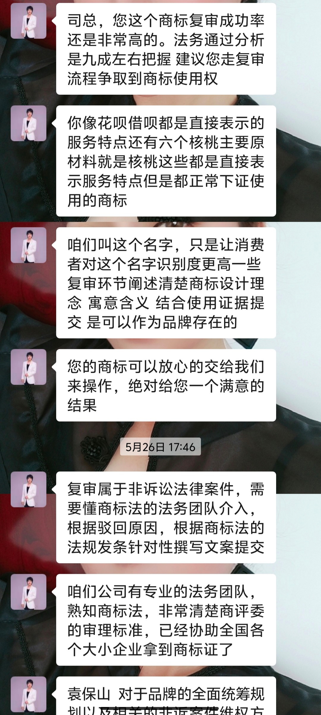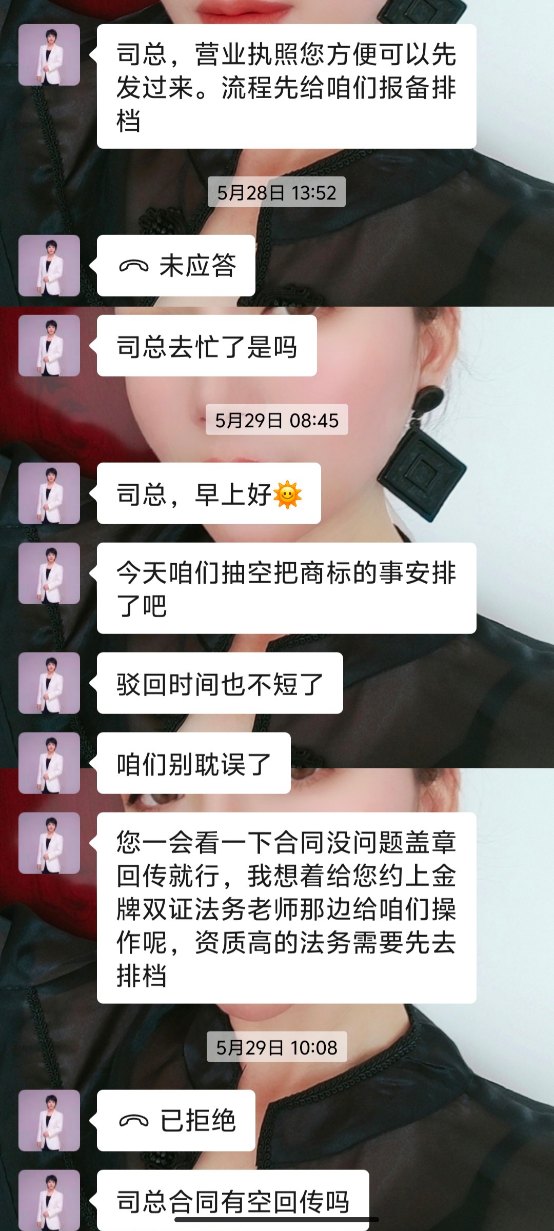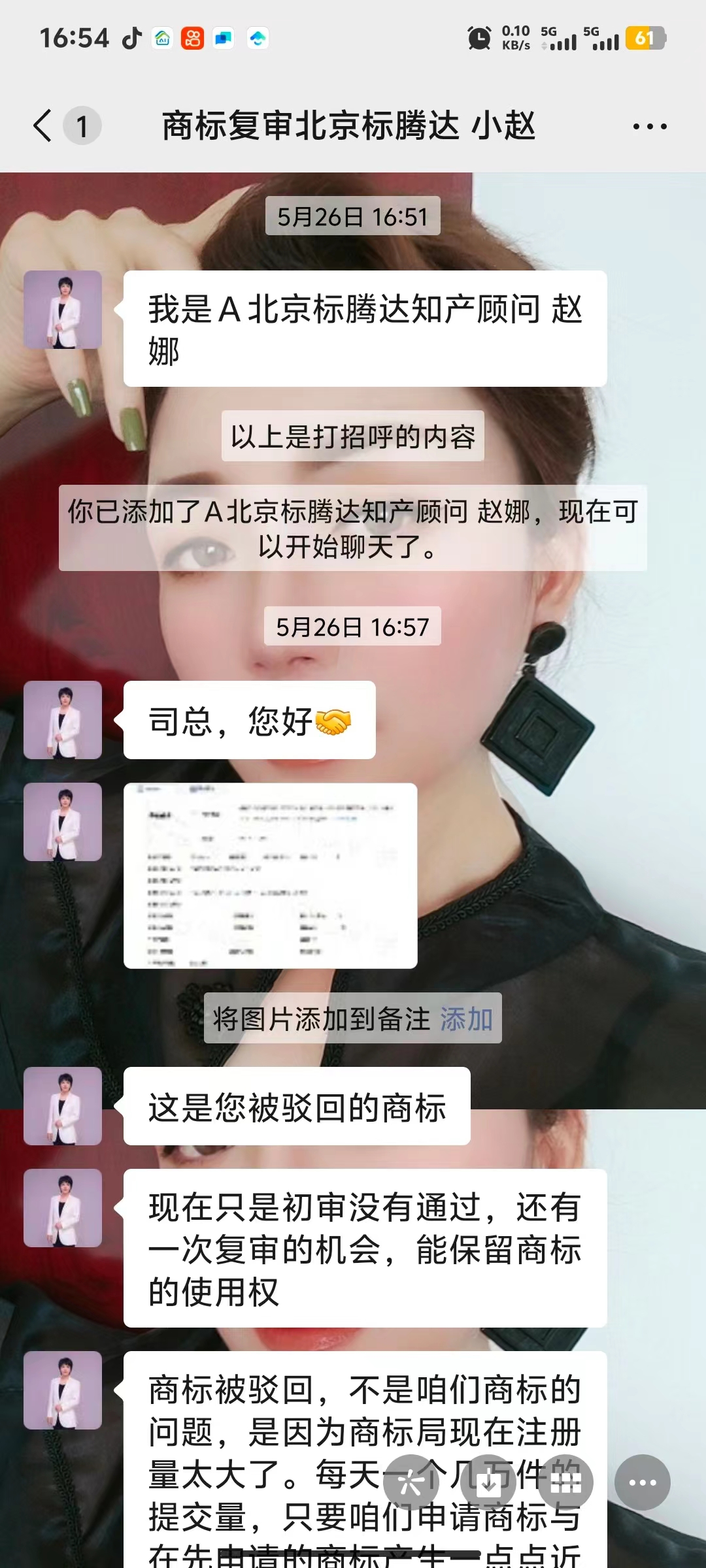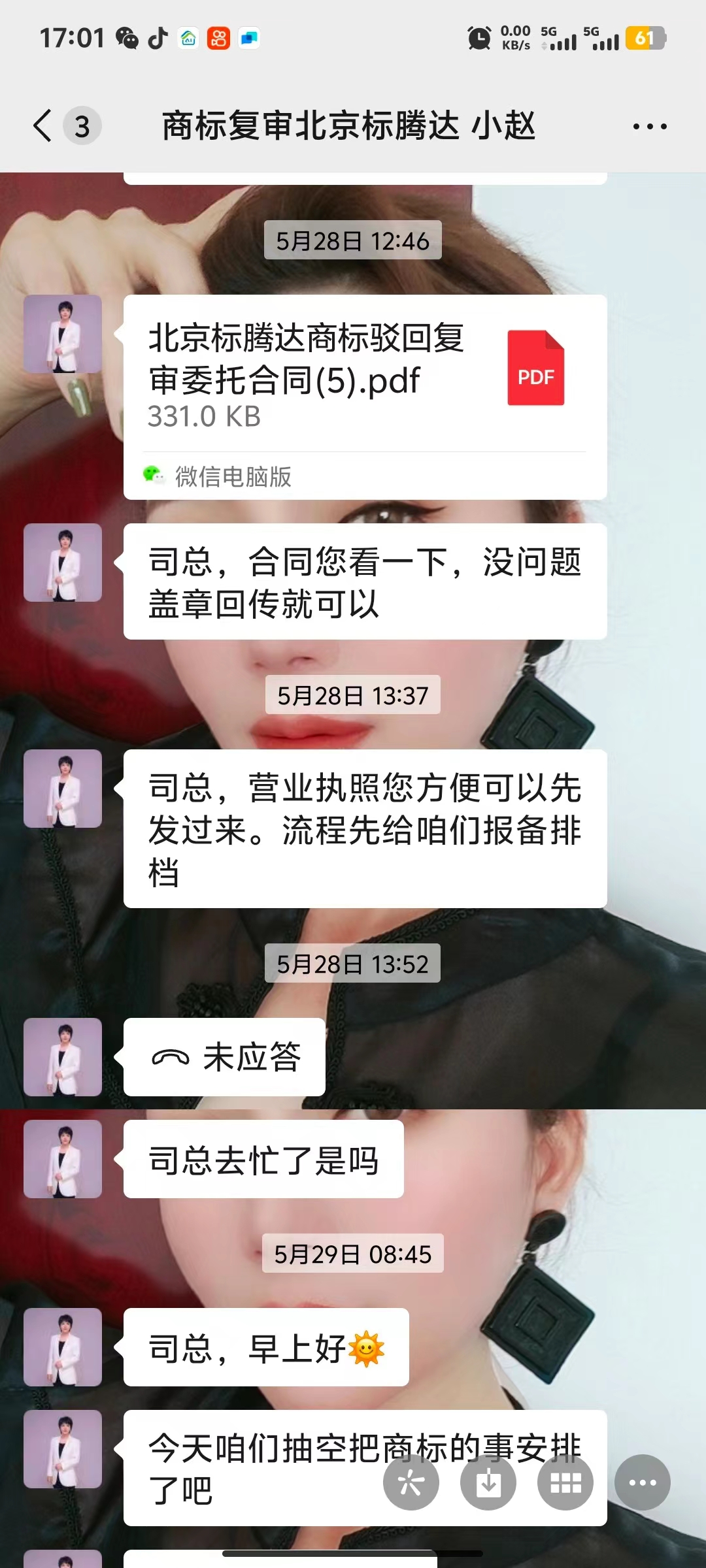 委托前,标腾达明确保证复审案件将由“知识产权金牌双证法务团队”负责,并向我发送了包括田菲律师在内的三位律师简介,强调其专业性。然而,从提交申请到复审结束,我从未收到任何法务委托协议或授权文件,所谓“金牌法务”是否真正参与了我的案件?我至今存疑。