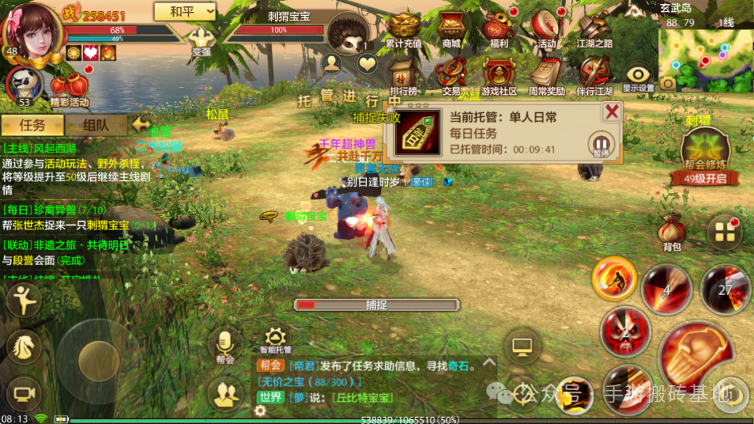 限时任务的镜湖剿匪,大龙会概率掉落珍贵的重楼碎片,提升符以及宝石和强化精华基本属性必参与的活动之一,如果时间还早的话,顺便将40级的主线剧情给它做完,顺道在燕子坞将限时任务的护宝神兽给他打掉。