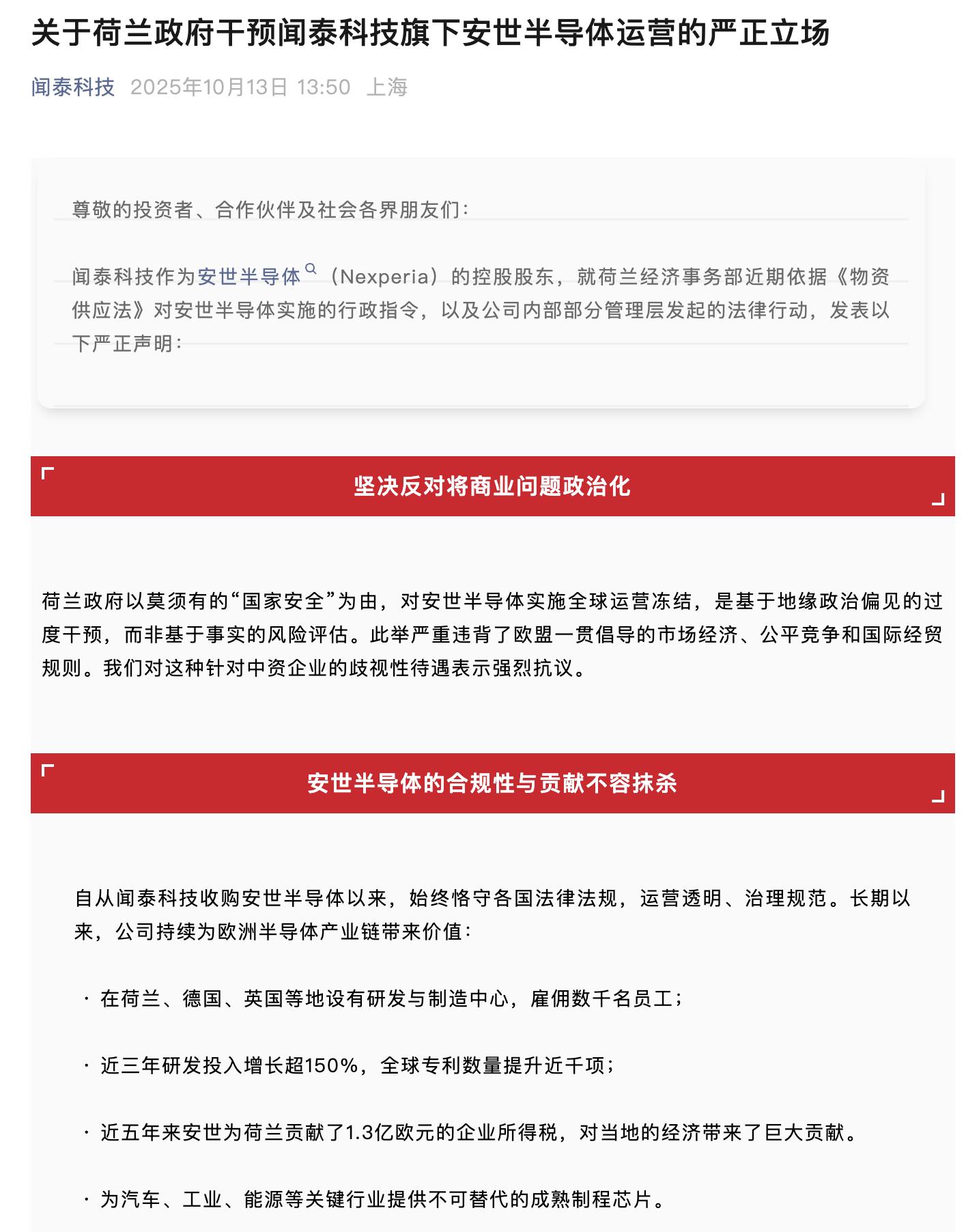 澎湃新闻:《闻泰回应子公司安世被荷兰政府冻结资产:个别外籍管理层以合规为名行夺权之实》(2025 年 10 月 12 日)