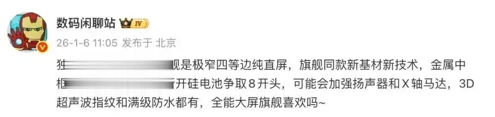 博主@数码闲聊站 的一份爆料中提到,Top5某大屏旗舰是极窄四等边纯直屏,旗舰同款新基材新技术,金属中框,简约镜组设计,新开硅电池争取8开头,可能会加强扬声器和X轴马达,3D超声波指纹和满级防水都有,定位“全能大屏旗舰”。