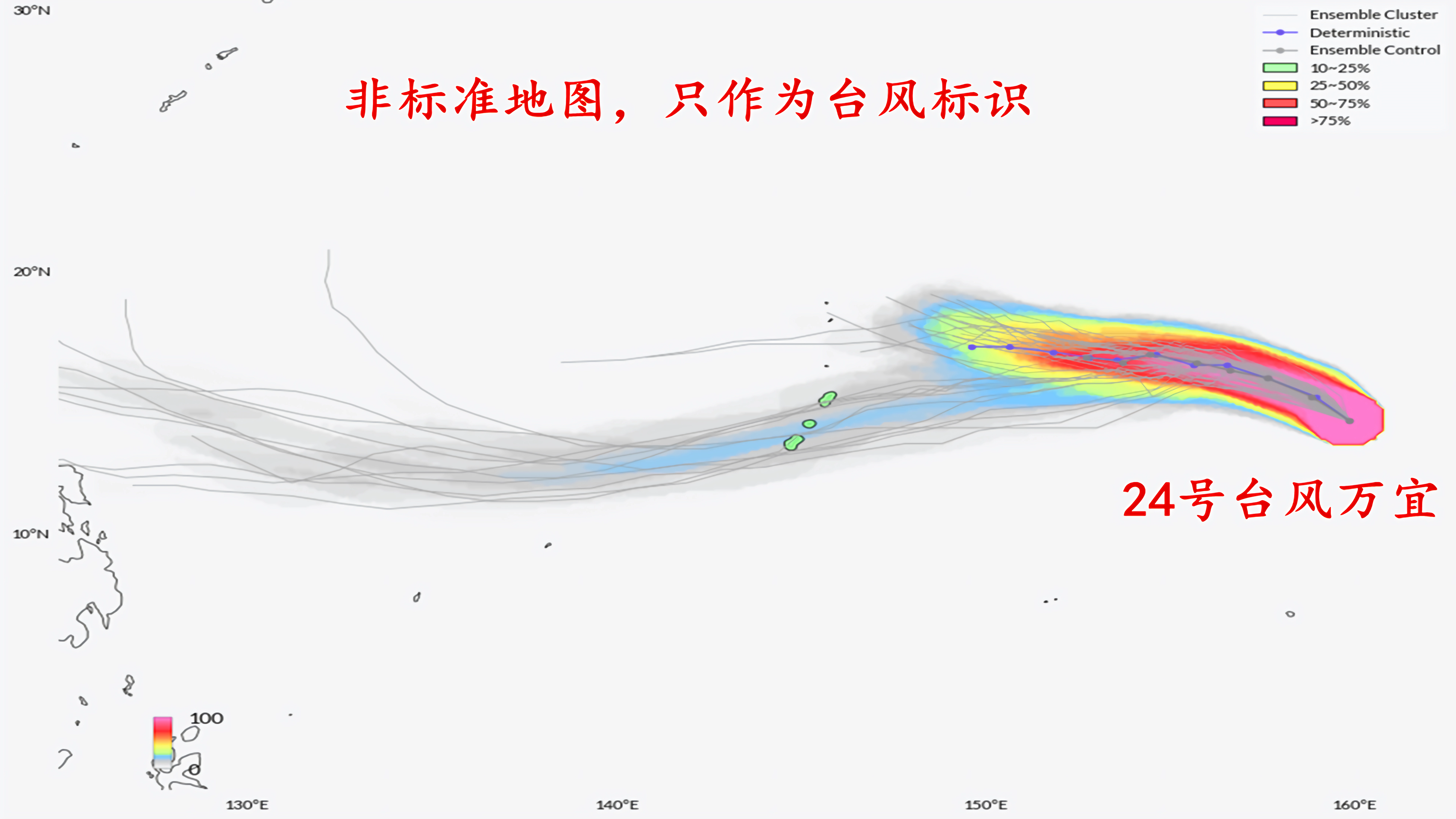 24号台风万宜,因其在远洋地区生成,中心其云系松散,未来生成较强台风比较困难,预计台风中心最强风力在9级,并与12日下午在西北太平洋美国关岛附近减弱为热带低压,并逐渐消散。对我国没有影响。