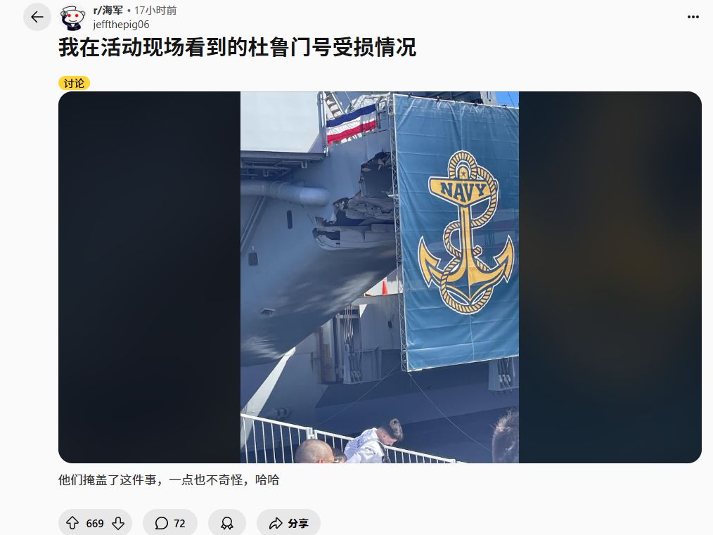 最近,一名美国网友在社交平台上爆料,说他去参加10月份在诺福克海军基地举行的“海军开放日”活动,结果路过杜鲁门号航母时,发现了一件让人哭笑不得的事。