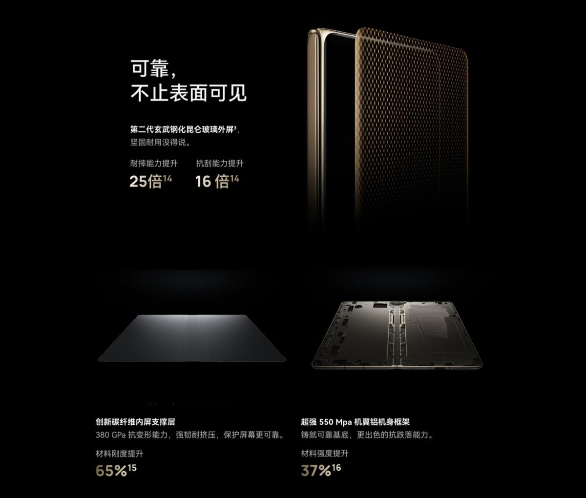 与此同时,还有耐摔能力提升25倍、抗刮耐磨能力提升16倍的第二代玄武钢化昆仑玻璃;刚度提升65%的创新碳纤维支撑层;屈服强度550MPa的机翼铝合金中框。无论是日常使用,还是户外等极端环境下的意外场景,都能提供更强的防护性,一句话总结,折叠屏的“脆弱”刻板标签已被彻底撕掉。