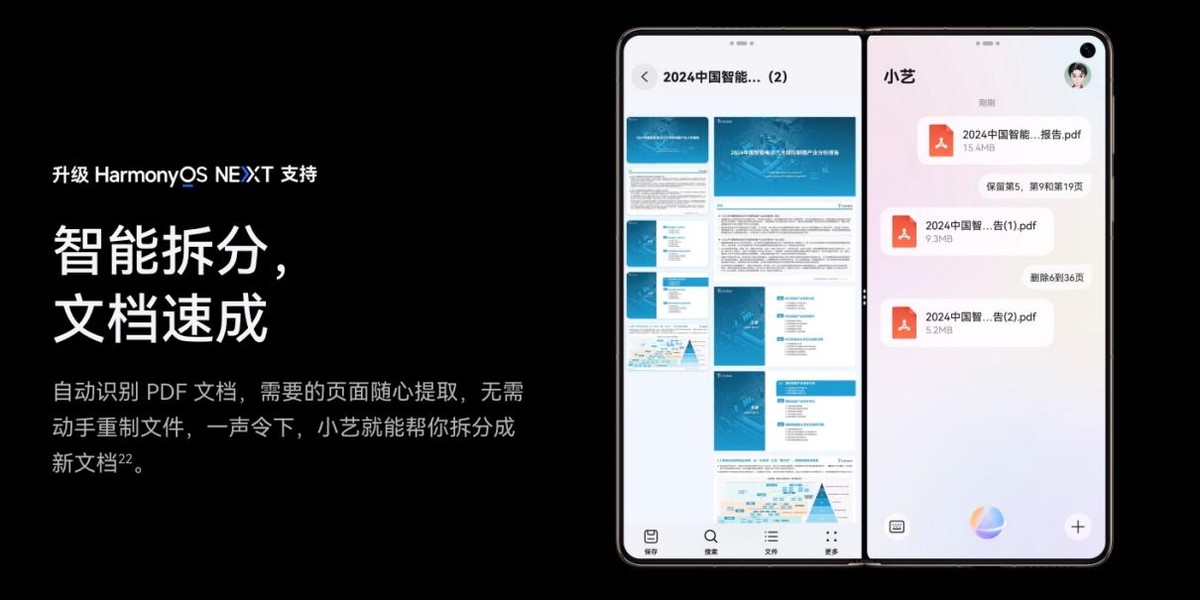 此外,AI的深度融合也给折叠屏的大屏体验带来更丰富的玩法。基于盘古大模型的全新小艺逻辑思维更强,理解能力更强,触发时可以智慧识别分屏,形成左右对照,既能保留原有内容,又不影响小艺界面。全新小艺能实现的功能还有非常多,例如一键生成图表、总结文档、扩写文案,甚至在阅读时自动提炼摘要等,十分贴心。