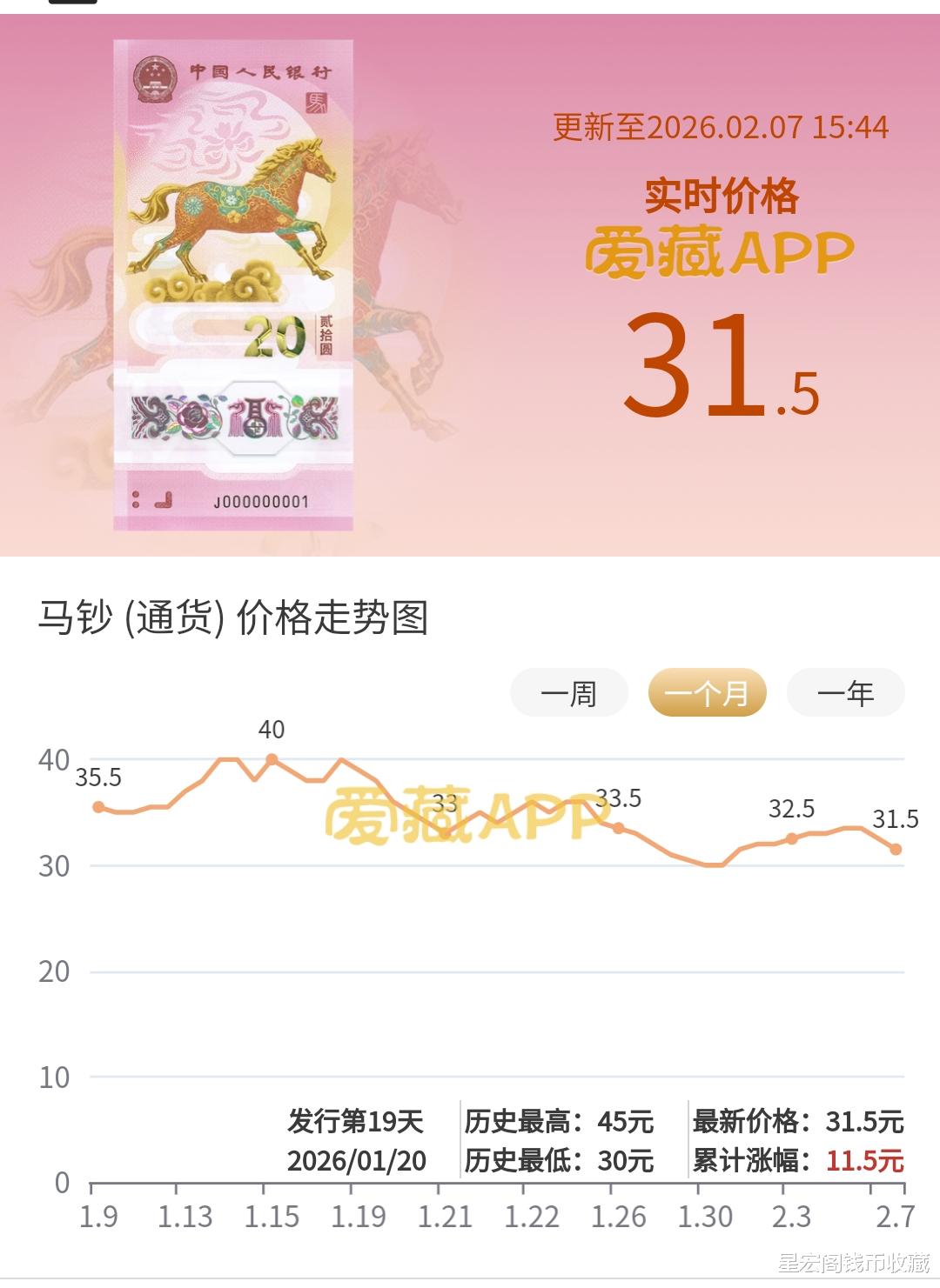 2026年马年纪念钞,目前来看市场行情也有一些小幅下跌,记得在前两天通货市场行情基本上还能保持在33元左右,现在通货市场行情也已经下跌到了30.5~31.5元左右。通货标准十连,目前市场行情基本上在32~33元左右。