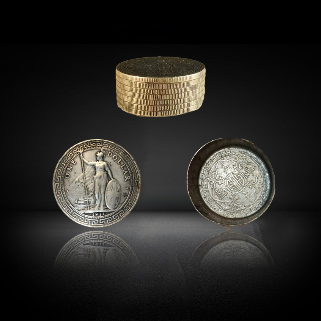 站洋套筒币,是近代中国贸易银元体系中一类特殊的遗存,特指以 1911 年版英国站洋(英国贸易银元)为原型、采用套筒工艺制作的仿造或投机性货币实物,其核心特征为中空双层结构、单币等效七枚面值,是清末民初特殊贸易环境与货币投机行为的产物,客观反映了半殖民地时期中国货币流通的混乱格局与殖民经济侵略的历史背景。